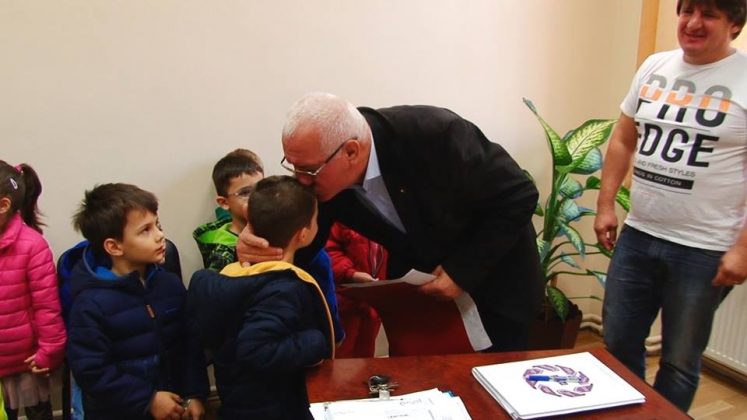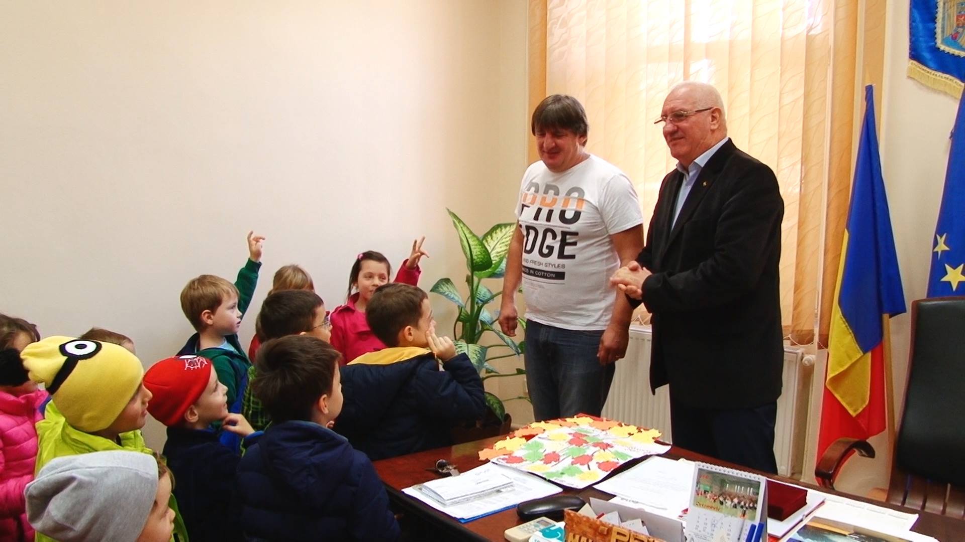 Copiii ai fost întrebaţi dacă ştiu unde se află, în ce birou, şi cum îl cheamă pe primar. Dacă la primele două întrebări au ştiut să răspundă, la cea de-a treia s-au fâstâcit, dar până la urmă s-au descurcat, primarul găsindu-şi şi un tiz printre copii, în ceea ce privește numele pe care-l poartă, cu care a bătut palma şi pe care apoi l-a sărutat pe frunte.