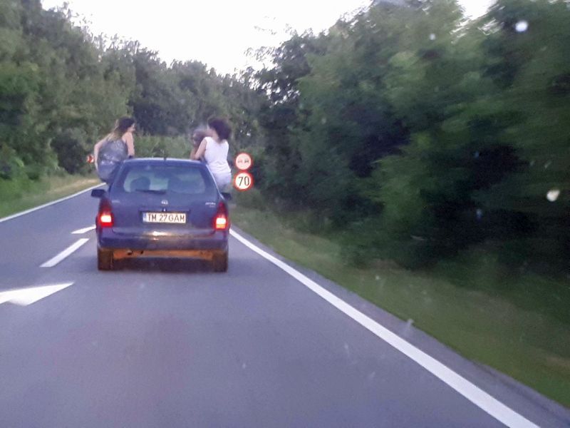 Pasagerii erau ieșiți în afara mașinii cu mai mult de jumătate din trupuri, fără să realizeze nici măcar pentru o clipă că ar fi putut să cadă pe șosea în orice moment. Șoferii care au trecut pe lânga tinerii teribiliști au fotografiat totul și au postat imaginile incredibile pe o rețea de socializare, pentru a atrage atenția asupra riscului la care se expun toți cei care se angrenează într-o astfel de joacă periculoasă!