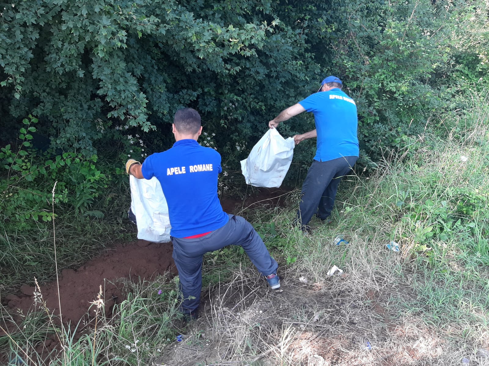 Au fost executate 2 minibaraje din saci cu nisip și sort cu nisip pe rigola DE 70 pentru izolarea petei poluante și s-a intervenit cu material absorbant peste emulsia de bitum, care e sursa de poluare.