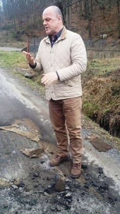 Ioan Popa a arătat jurnaliștilor un material din stratul de asfalt, care nu se folosește de obicei la asemenea operațiuni de asfaltare și care, păstrând umezeala, crapă stratul de asfalt precum o suprafață mozaicată.