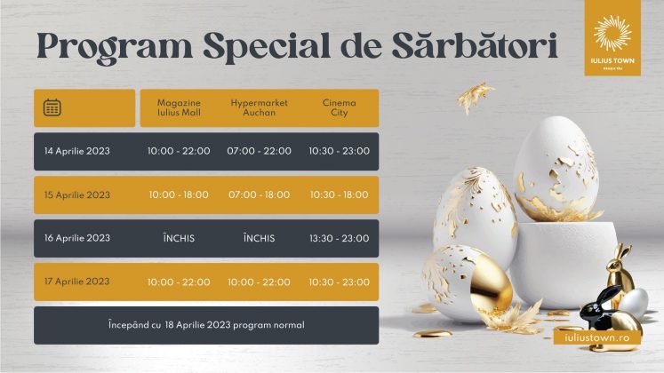 Dacă mai ai de făcut ultimele cumpărături pentru masa de Paște și trebuie să mai iei câteva cadouri, atunci cu siguranță trebuie să știi că ansamblul Iulius Town este deschis vineri, 14 aprilie, conform programului normal, 10.00 – 22.00, iar sâmbătă, de la ora 10.00 până la 18.00. În prima zi de Paște cu toții suntem alături de cei dragi, iar mall-ul este închis, cu excepția Cinema City, dar de luni, 17 aprilie, programul revine la normal.