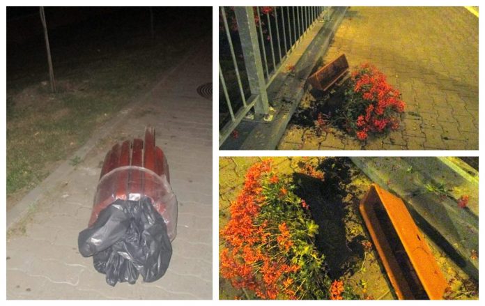”Polițiștii locali aflați în patrulare azi-noapte au depistat, în jurul orei 01.15, pe Podul Michelangelo, un tânăr care a deteriorat două jardiniere cu flori și patru coșuri de gunoi stradal, pe care le-a lovit cu picioarele răsturnându-le. Tânărul, în vârstă de 21 de ani, cu domiciliul în localitatea Corabia, județul Olt, a recunoscut că a fost nervos și că a lovit obiectele de mobilier urban fără intenție”, au tansmis polițiștii.