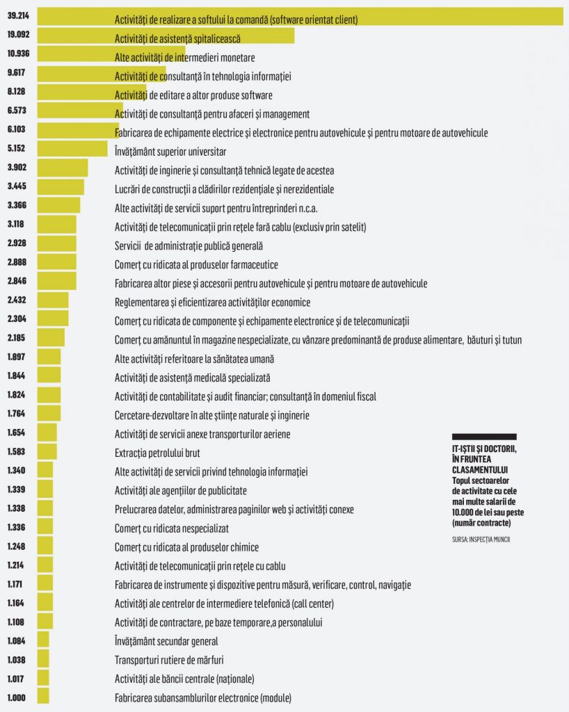 Judeţele care au cei mai puţini angajaţi cu salarii lunare brute de 10.000 de lei sau mai mari sunt Mehedinţi – 460 de contracte de muncă, Caraş-Severin – 493, Ialomiţa – 510, Vrancea – 511 şi Tulcea, cu 514 de astfel de contracte de muncă, conform informaţiilor de la Inspecţia Muncii. La nivel de industrii, salariile de 10.000 de lei sau mai mari sunt cel mai des întâlnite în companiile care au activităţi de activităţi de realizare a softului la comandă, activităţi de asistenţă spitalicească, alte activităţi de intermedieri monetare, activităţi de consultanţă în tehnologia informaţiei sau activităţi de editare a altor produse software. „Evident că în industrii în care posturile presupun o calificare foarte specifică şi studii superioare, cât şi senioritate în anumite domenii, salariile vor începe de la un nivel competitiv al pieţei pentru astfel de posturi. Când ne uităm la valorile medii ale salariilor din industrii ca IT, farma, este firesc ca media să fie mult mai ridicată pentru că specialiştii din aceste domenii sunt la un nivel salarial în continuă creştere, care se cumulează cu salariile posturilor de management şi top management, influenţând deci valoarea medie ridicată în aceste cazuri”, explică Oana Botolan Datki. Printre sectoarele economiei care au circa 1.000 de contracte de muncă plătite cu un salariu lunar brut de 10.000 de lei sau mai mare sunt fabricarea subansamblurilor electronice (module), activităţi ale băncii centrale naţionale, transporturi rutiere de mărfuri, învăţământul secundar general, precum şi cea de activităţi de contractare, pe baze temporare, a personalului, conform sursei citate.