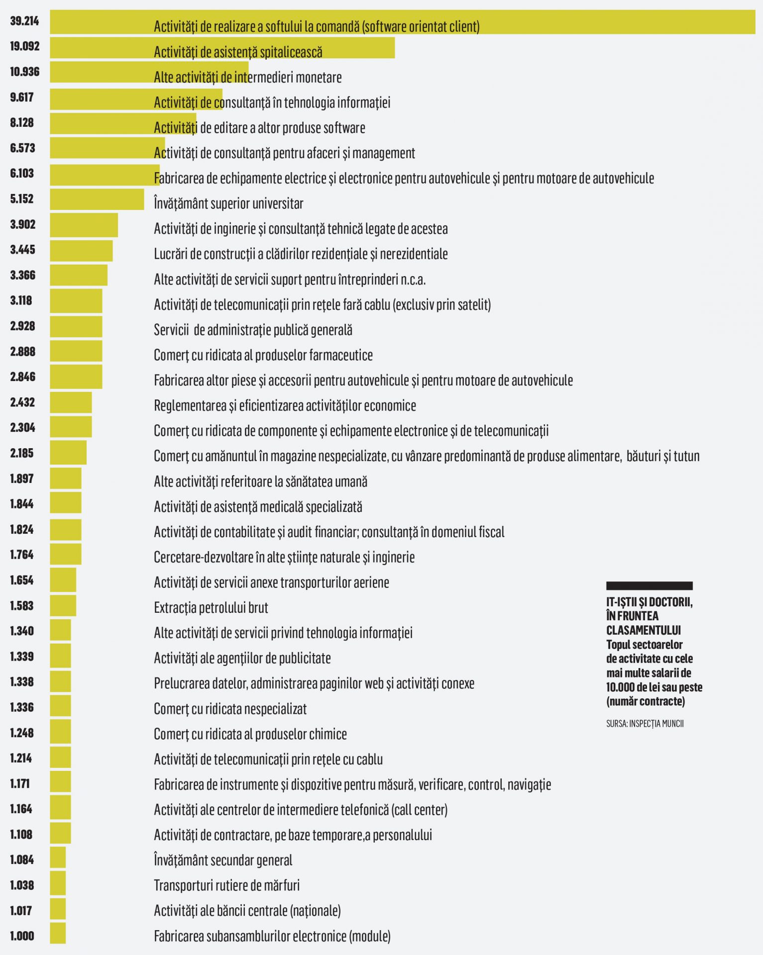 Judeţele care au cei mai puţini angajaţi cu salarii lunare brute de 10.000 de lei sau mai mari sunt Mehedinţi – 460 de contracte de muncă, Caraş-Severin – 493, Ialomiţa – 510, Vrancea – 511 şi Tulcea, cu 514 de astfel de contracte de muncă, conform informaţiilor de la Inspecţia Muncii. La nivel de industrii, salariile de 10.000 de lei sau mai mari sunt cel mai des întâlnite în companiile care au activităţi de activităţi de realizare a softului la comandă, activităţi de asistenţă spitalicească, alte activităţi de intermedieri monetare, activităţi de consultanţă în tehnologia informaţiei sau activităţi de editare a altor produse software. „Evident că în industrii în care posturile presupun o calificare foarte specifică şi studii superioare, cât şi senioritate în anumite domenii, salariile vor începe de la un nivel competitiv al pieţei pentru astfel de posturi. Când ne uităm la valorile medii ale salariilor din industrii ca IT, farma, este firesc ca media să fie mult mai ridicată pentru că specialiştii din aceste domenii sunt la un nivel salarial în continuă creştere, care se cumulează cu salariile posturilor de management şi top management, influenţând deci valoarea medie ridicată în aceste cazuri”, explică Oana Botolan Datki. Printre sectoarele economiei care au circa 1.000 de contracte de muncă plătite cu un salariu lunar brut de 10.000 de lei sau mai mare sunt fabricarea subansamblurilor electronice (module), activităţi ale băncii centrale naţionale, transporturi rutiere de mărfuri, învăţământul secundar general, precum şi cea de activităţi de contractare, pe baze temporare, a personalului, conform sursei citate.