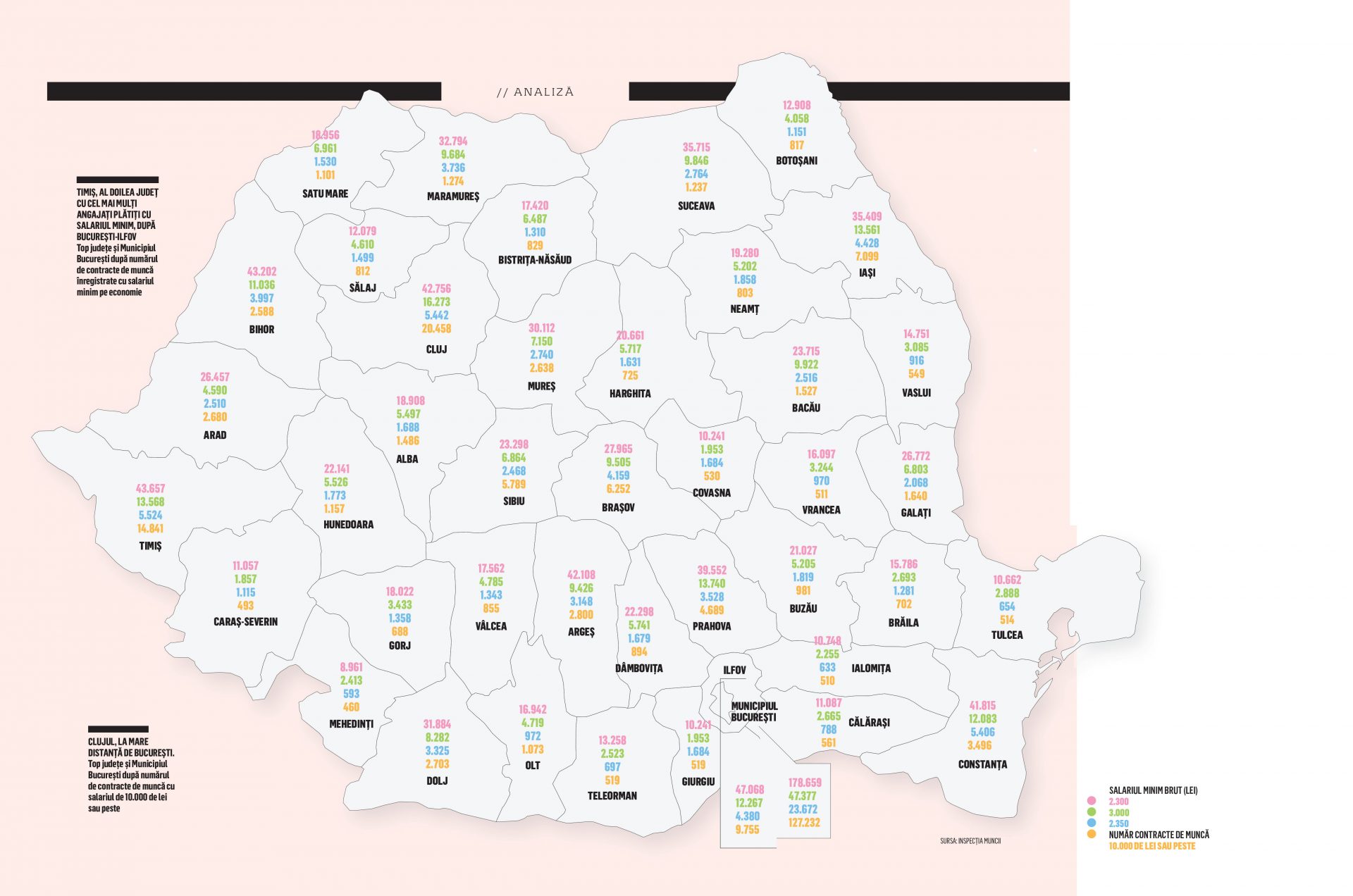 Economia locală are peste 5,5 milioane de contracte de muncă înregistrate în REVISAL, iar dintre aceşti salariaţi aproape 1,58 de milioane de angajaţi câştigă salariul minim pe economie. În contrast, doar 236.787 dintre ei aveau un câştig lunar brut de peste 10.000 de lei. În afară de zona Bucureşti-Ilfov, judeţul Timiş are cei mai mulţi angajaţi plătiţi cu salariul minim pe economie. La polul opus, salariile de 10.000 de lei şi peste sunt cel mai des întâlnite în Bucureşti şi Cluj.