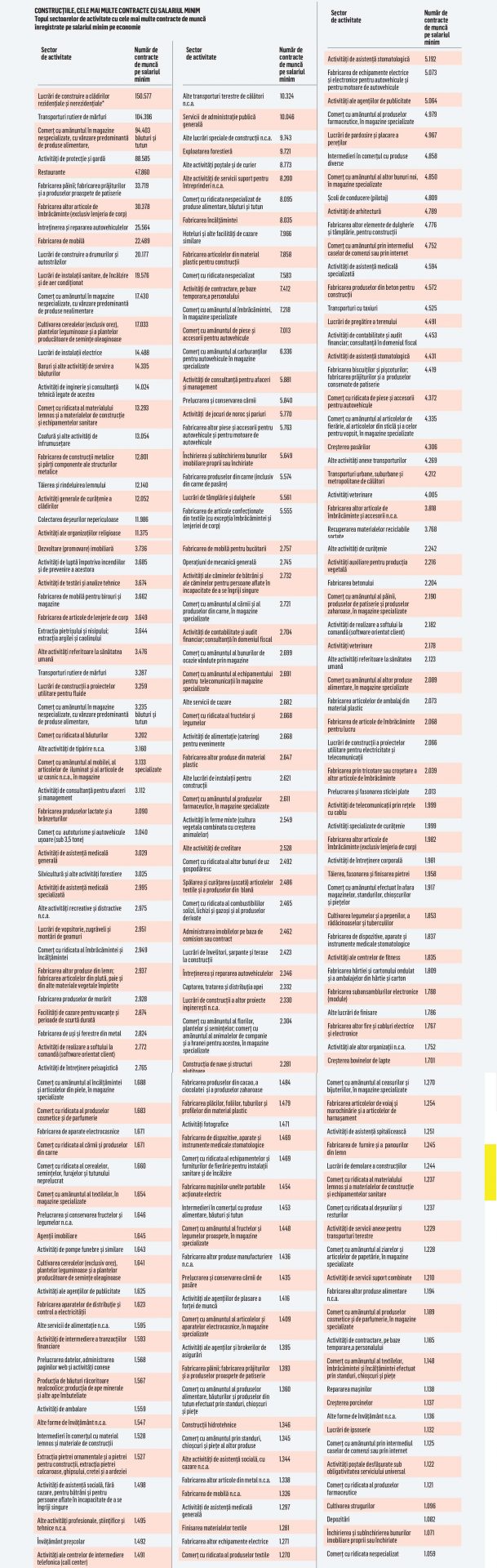 „Contractele de muncă înregistrate în Registrul General de Evidenţă a Salariaţilor în format electronic conţin, conform HG. nr. 905/2017, art.3, lit. h), următoarele date: salariul de bază lunar brut, precum şi indemnizaţiile şi sporurile cu caracter permanent, astfel cum sunt prevăzute de Legea nr. 53/2003 republicată, cu modificările şi completările ulterioare”, răspunde solicitării trimise de Ziarul Financiar Dantes Nicolae Bratu, inspector general de stat în cadrul Inspecţiei Muncii. Astfel, rezultă că salariile înregistrate în REVISAL conţin atât salariul de bază, cât şi sporurile permanente pe care le primesc angajaţii. Pe industrii, cele mai multe contracte de muncă plătite cu salariul minim pe economie au fost în construcţii, transporturi rutiere de mărfuri şi în comerţ cu amănuntul.