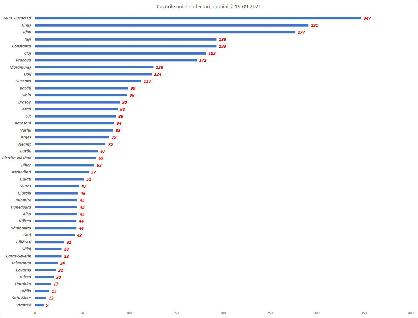 Capitala rămâne orașul cu cele mai multe cazuri noi, chiar dacă în scădere față de sâmbătă: 347 noi infectări. Timiș urcă la 291 de noi cazuri, fiind pe poziția a doua, în vreme ce Ilfov este pe locul 3 la noile infectări, cu 277 cazuri. Cât privește rata de infectare, Satu Mare conduce în top cu 3,21 la mie (creștere față de 3,11 din ziua precedentă), urmată de Ilfov (2,93), Timiș (2,54) și Bistrița-Năsăud (2,51) În București, rata de infectare a urcat la 2,44 la mie.