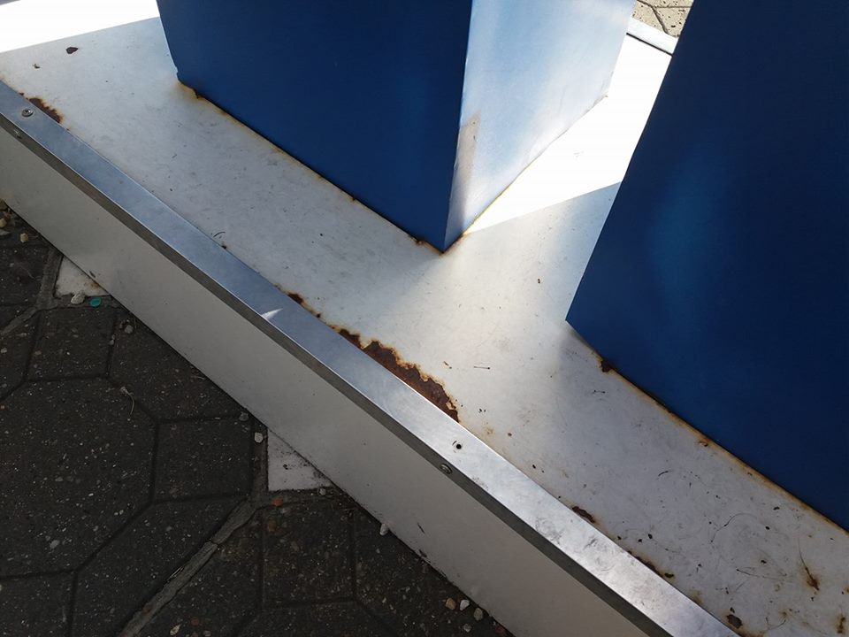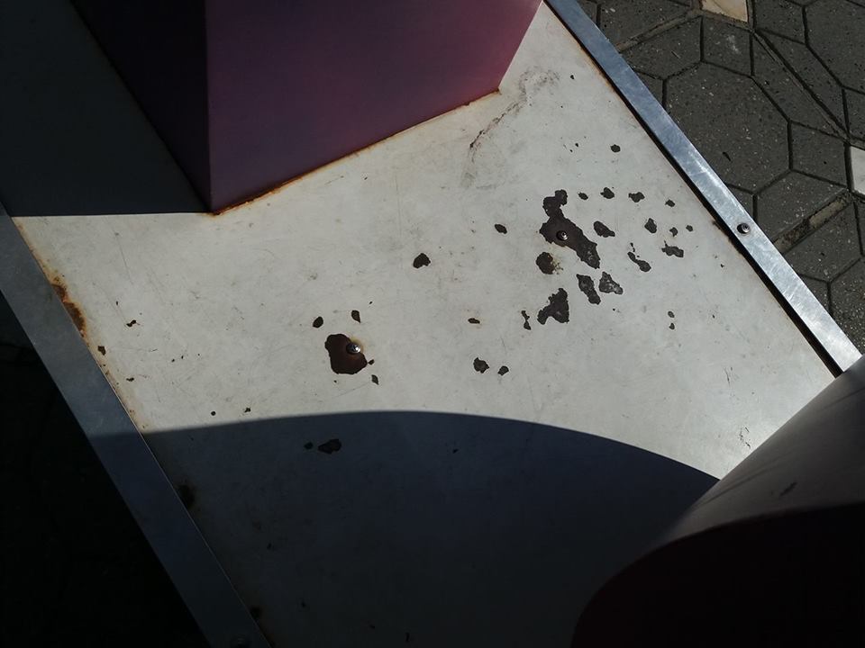Construcția de litere ciudate a început deja să ruginescă pe la unele părți mai expuse unde s-a dus vopseaua. Semn că nici nu a fost construită cu prea mare grijă. Sau stângacii meșteri erau la prima lor lucrare.
