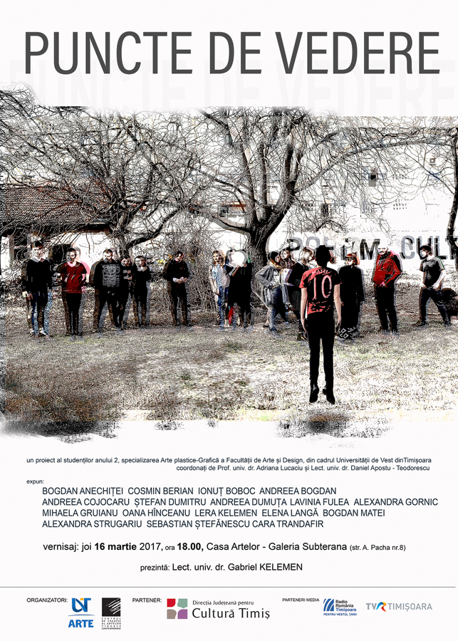 Dacă de obicei vizitatorii unei expoziții sunt chemați doar să privească lucrările, de acestă data sunt invitați să creeze o operă. Galeria Subterana din Casa Artelor își deschide porțile pentru prima expoziție din acest an. Protagoniști ai exercițiului plastic care își găsește loc aici vreme de două săptămâni sunt studenți din anul II, specializarea Grafică, de la Facultatea de Arte și Design din UVT, studenți coordonați de prof. univ.dr. Adriana Lucaciu și lect. univ. dr. Daniel Apostu Teodorescu. Proiectul denumit Puncte de vedere este un proiect expozițional de grup, în care tinerii artiști pun în discuție raportul dintre ”unu” – individ și ”multiplu” – grup, mulțime / public, societate; o temă despre responsabilitate individuală și colectivă, față de propriul destin artistic și cel al semenilor din proximitate.