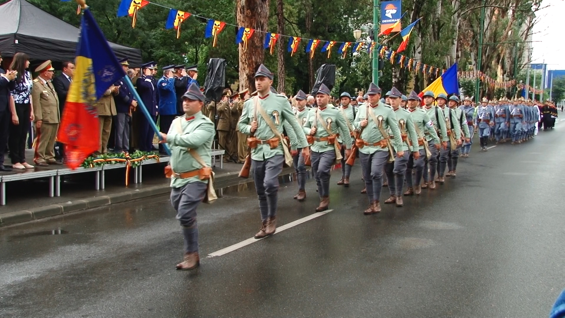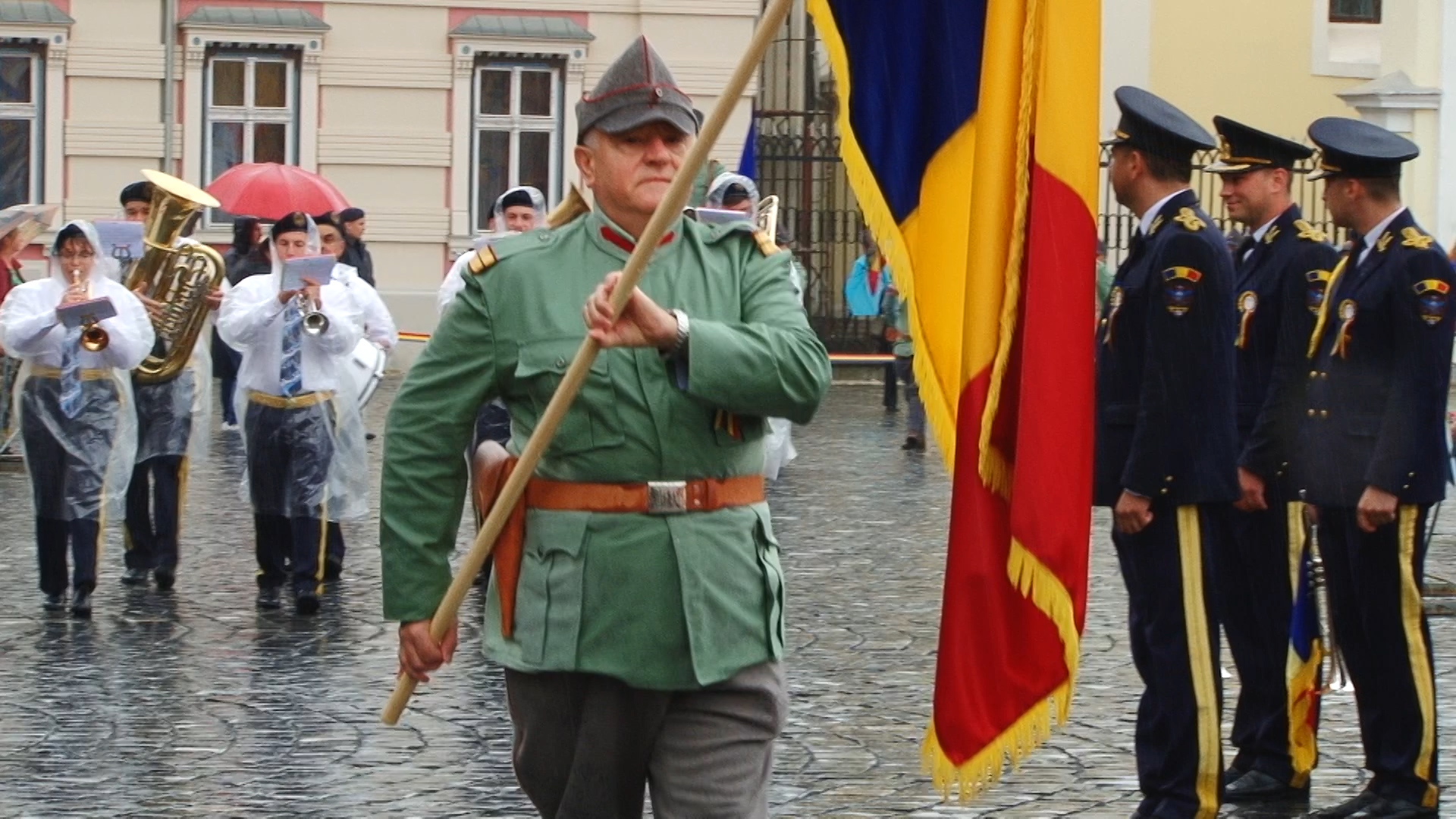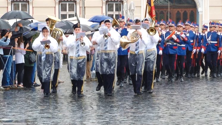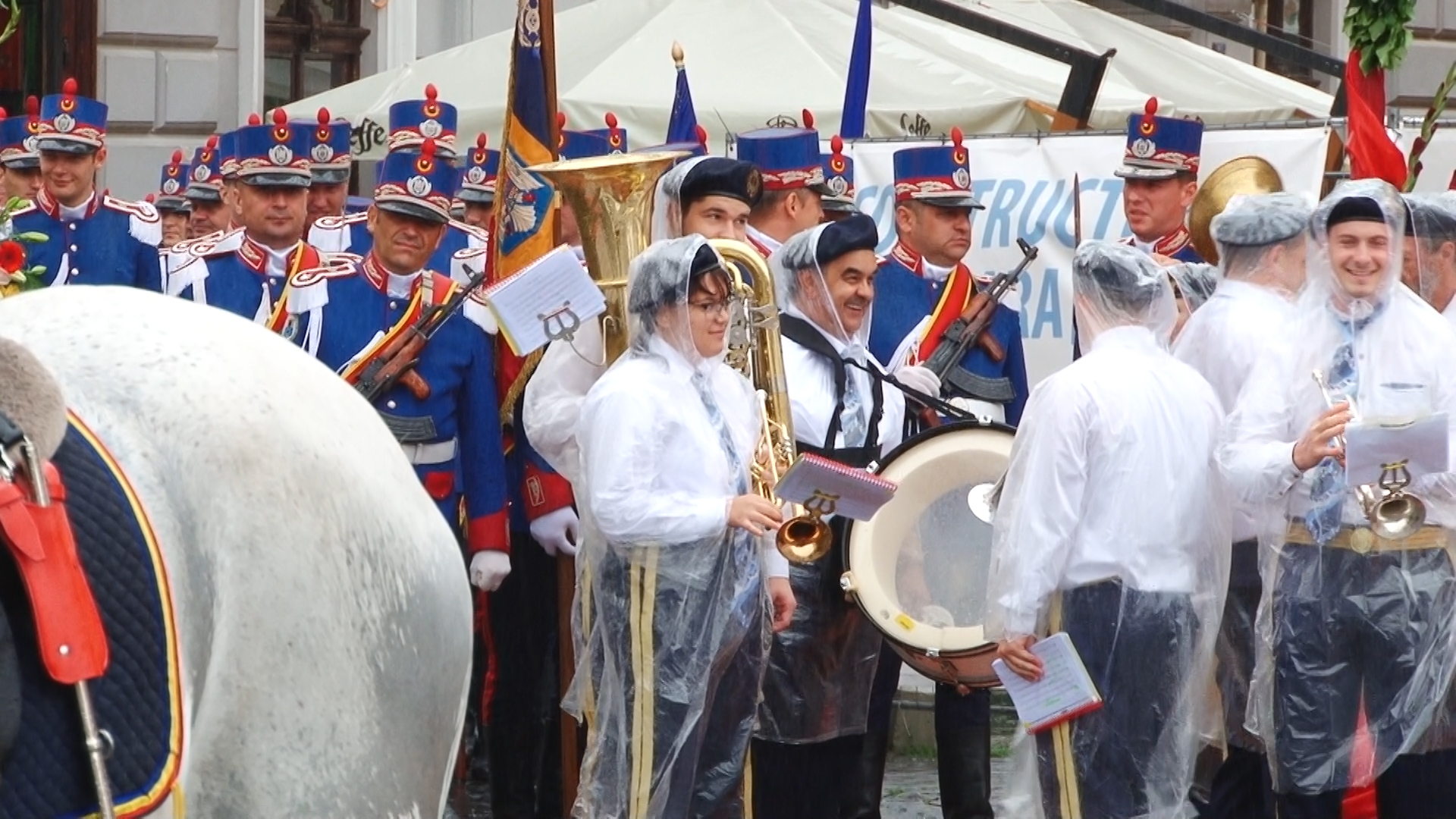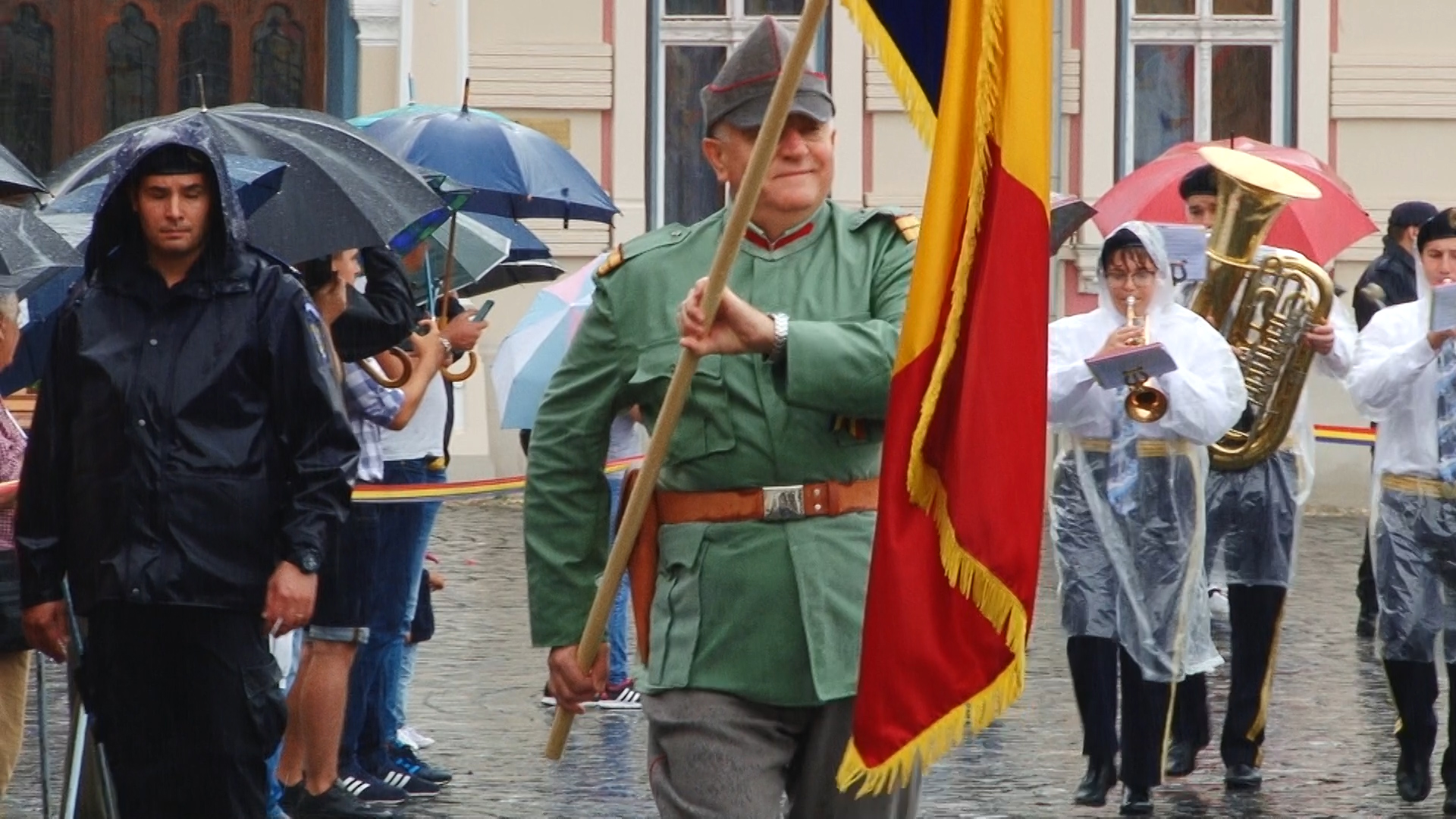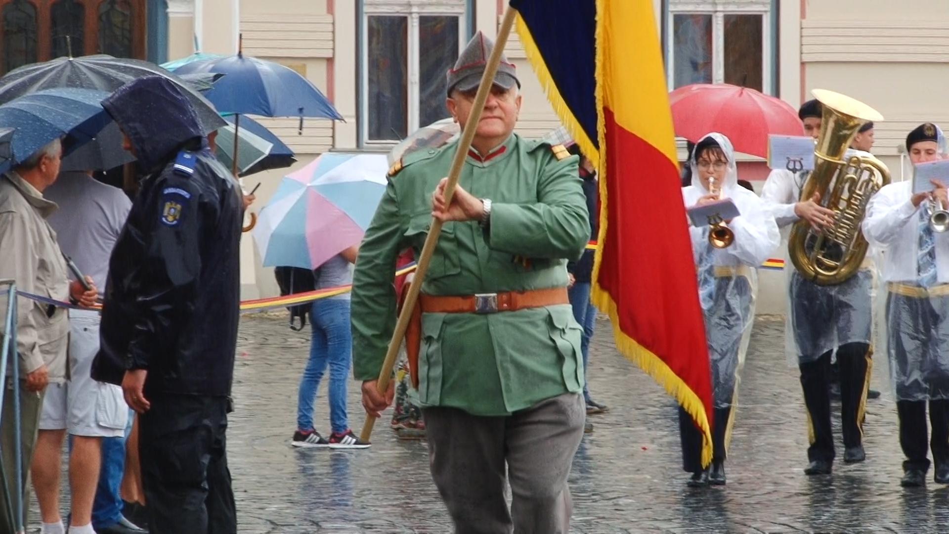 Momentului sărbătoresc i-a fost ciuntit fastul din cauza vremii potrivnice dar soldații totuși au defilat cu entuziasm prin băltoace cu uniformele îngreunate de apă.