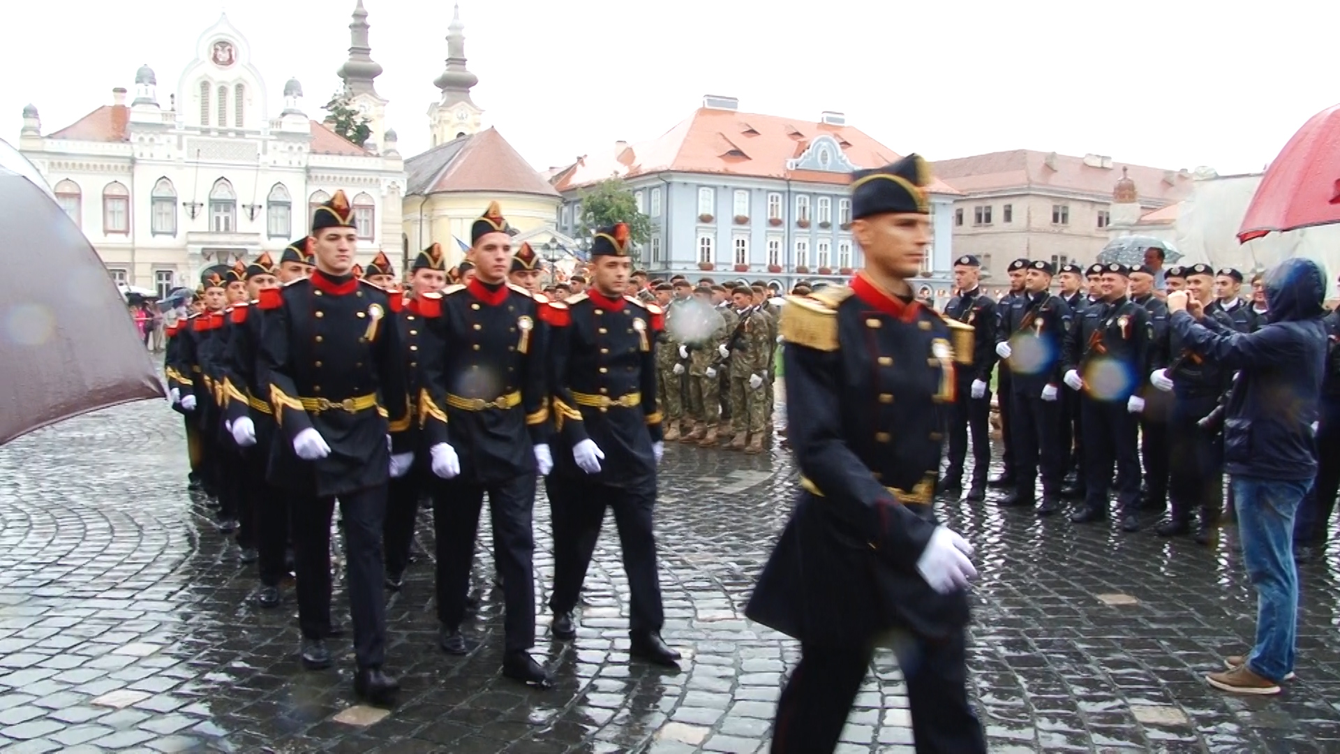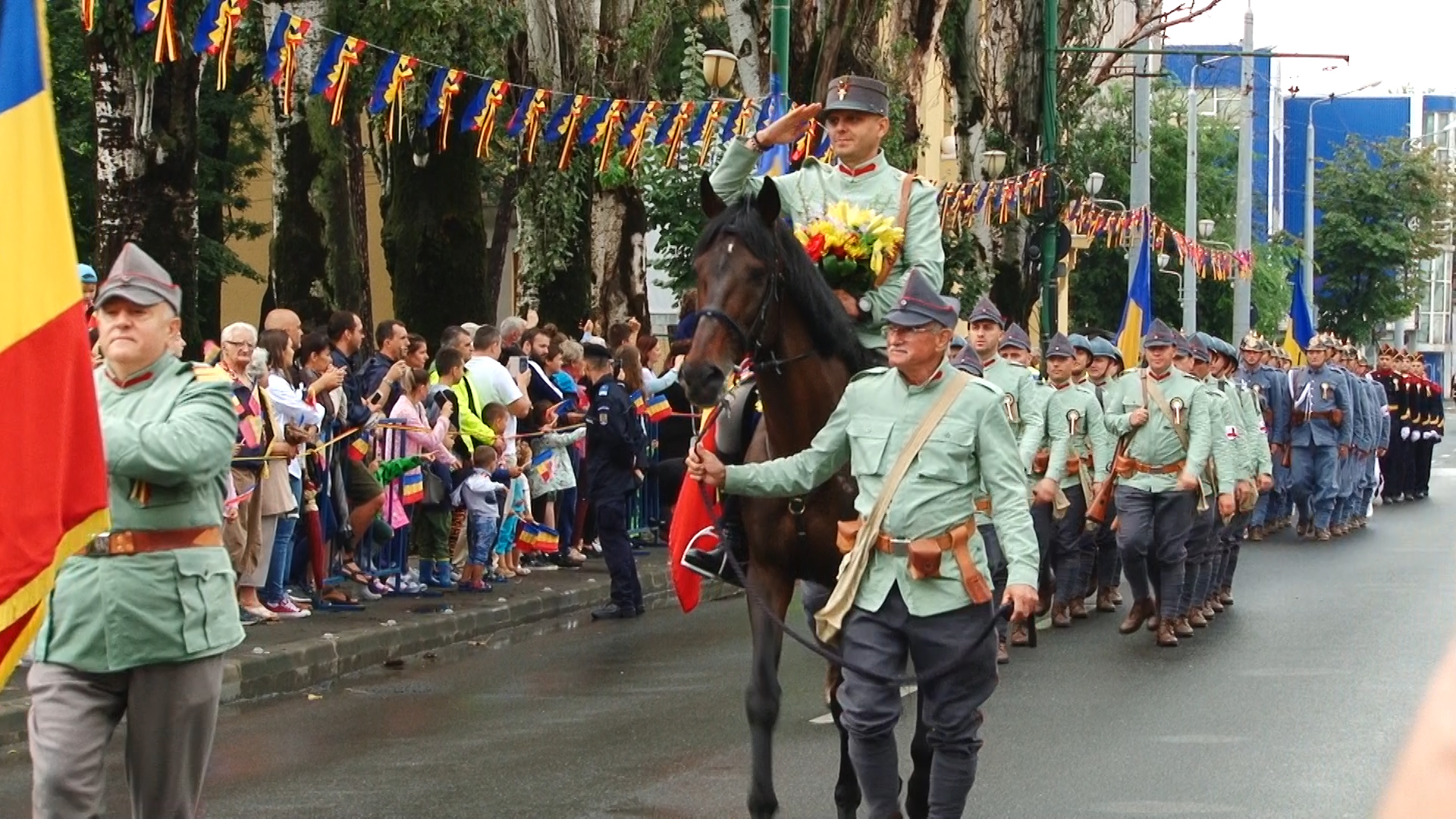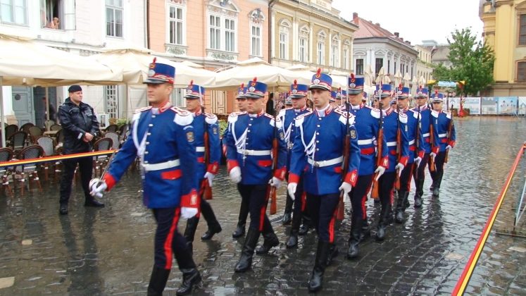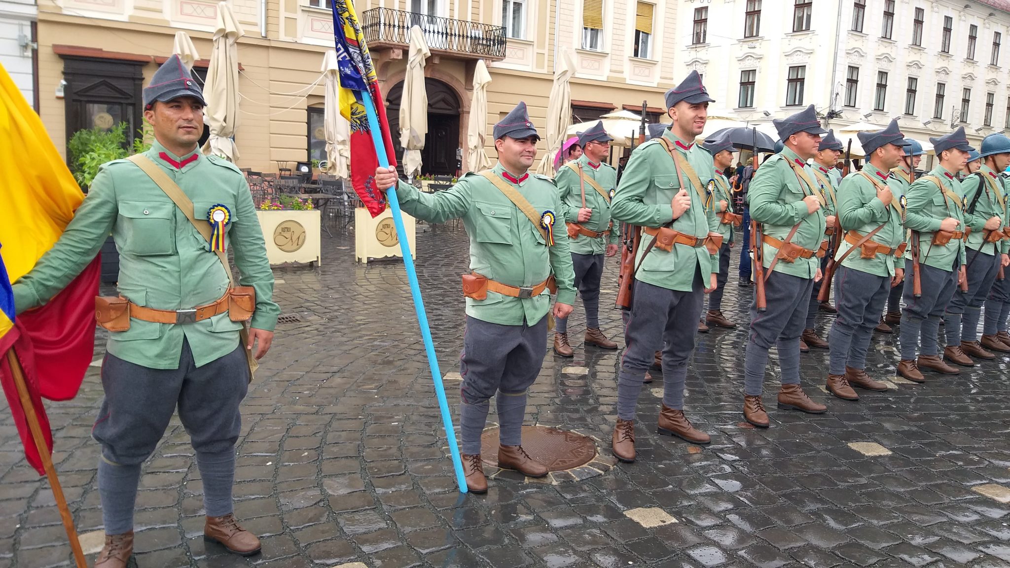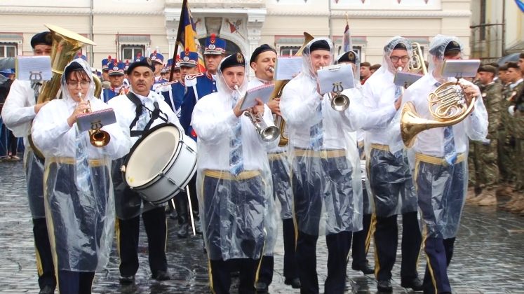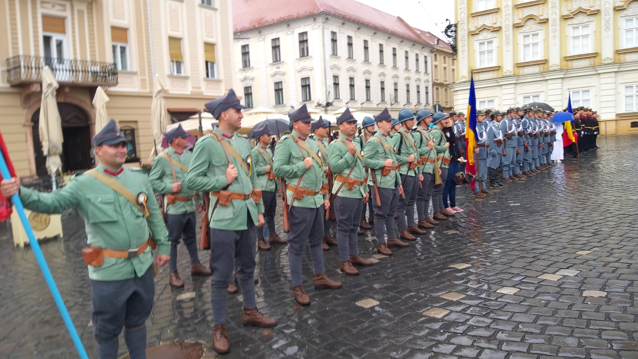 Momentului sărbătoresc i-a fost ciuntit fastul din cauza vremii potrivnice dar soldații totuși au defilat cu entuziasm prin băltoace cu uniformele îngreunate de apă.