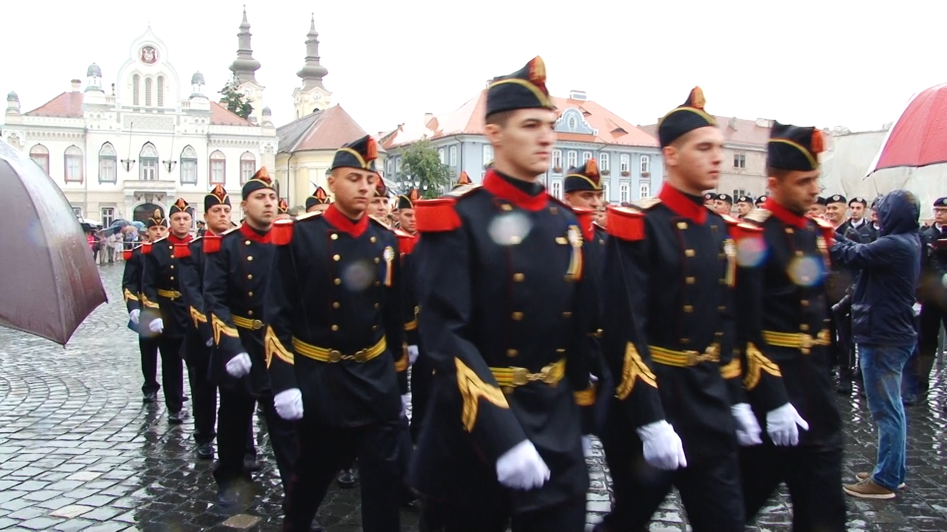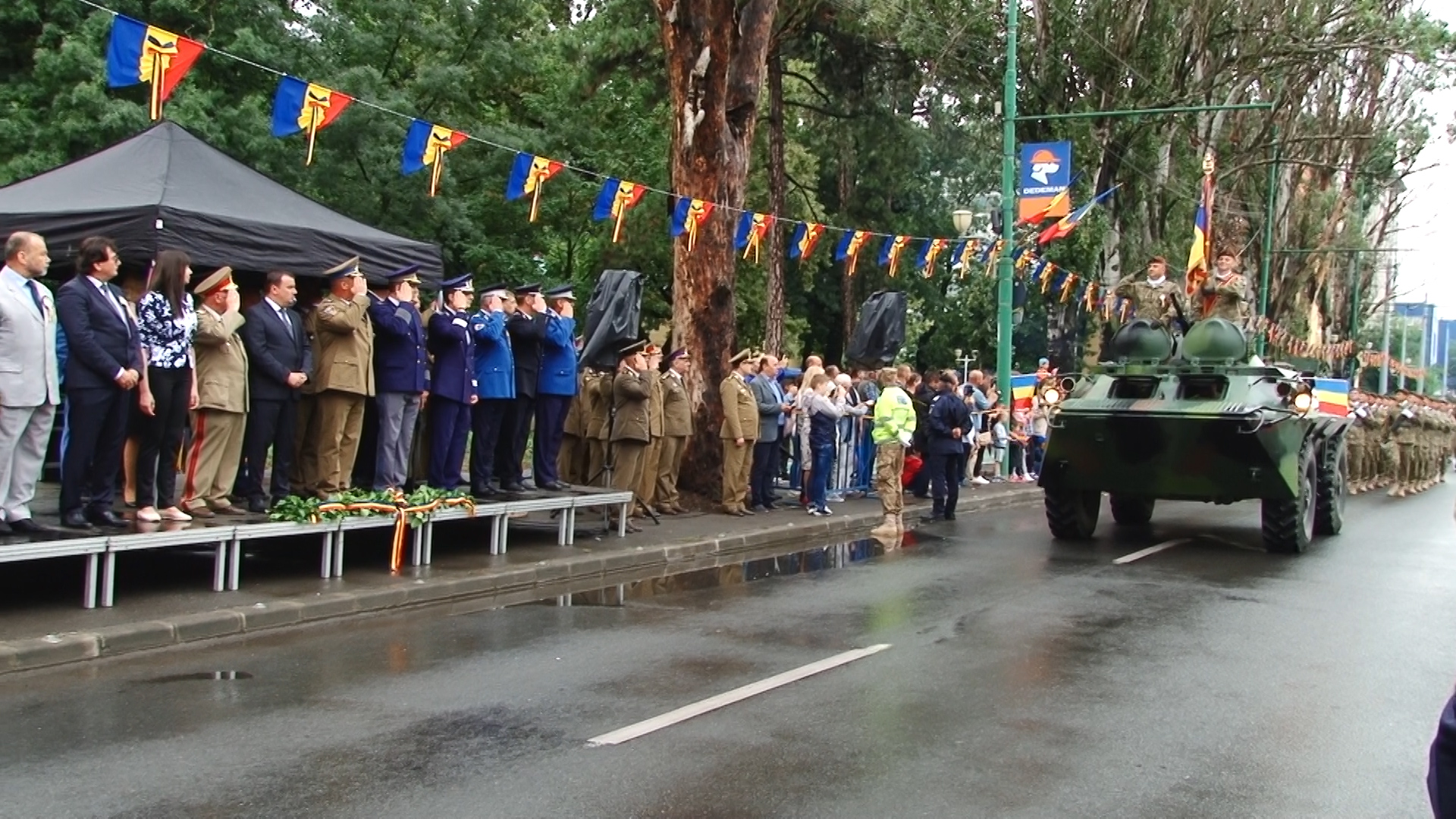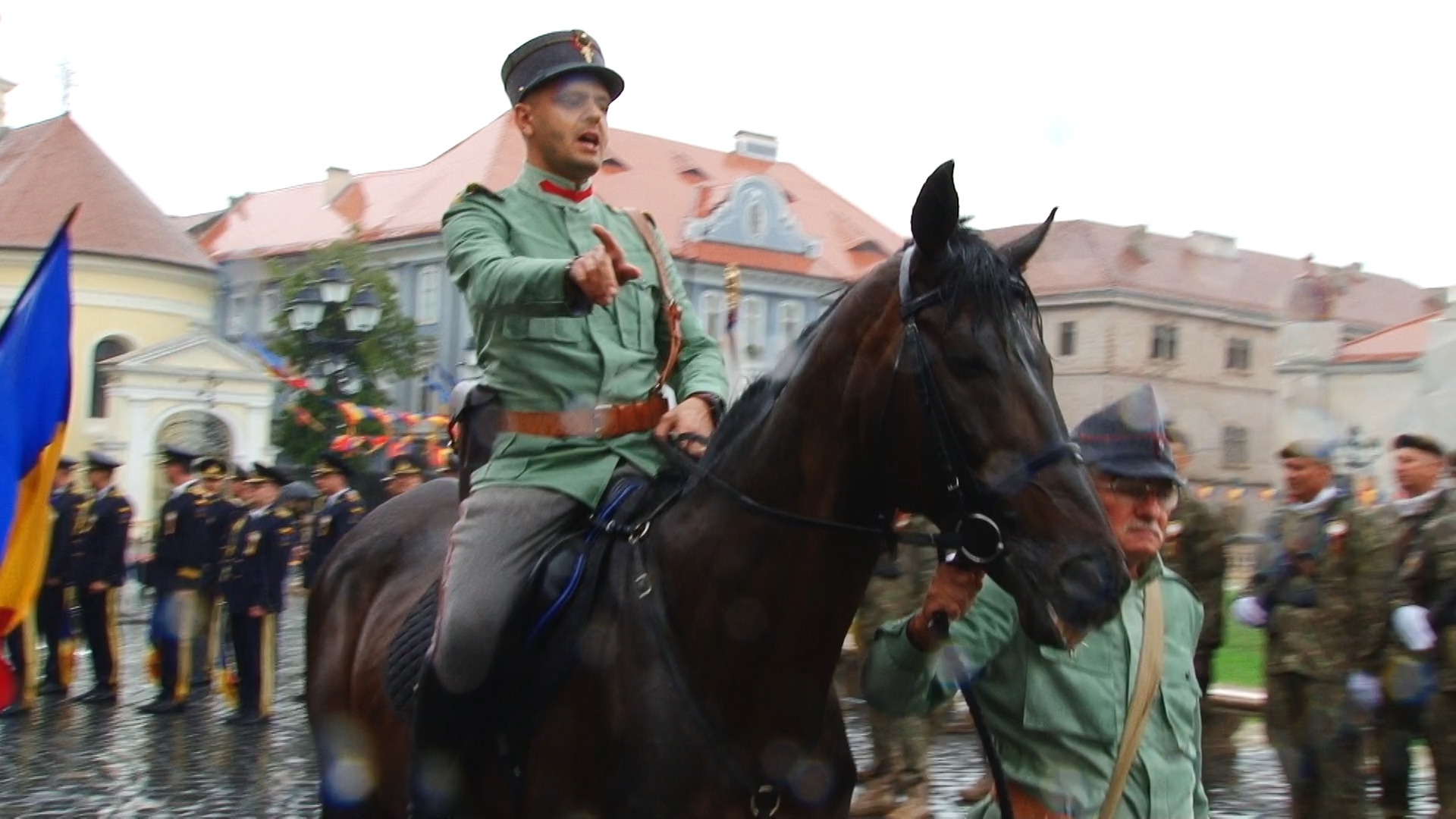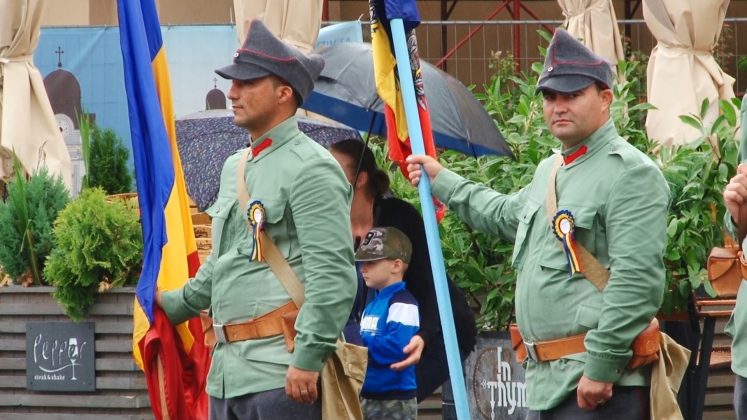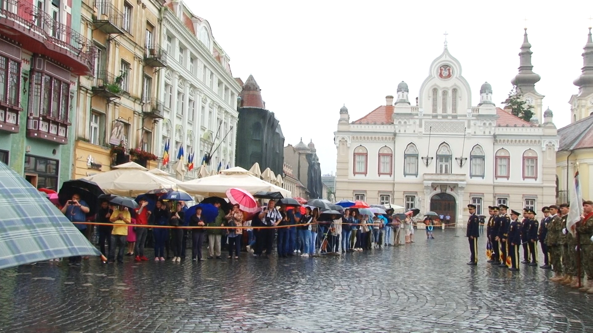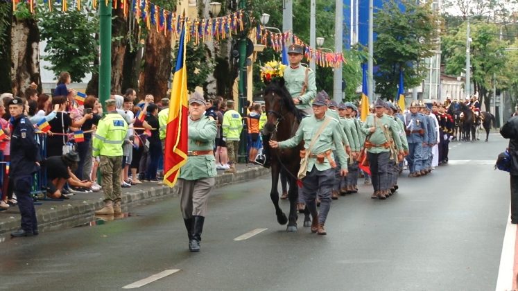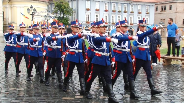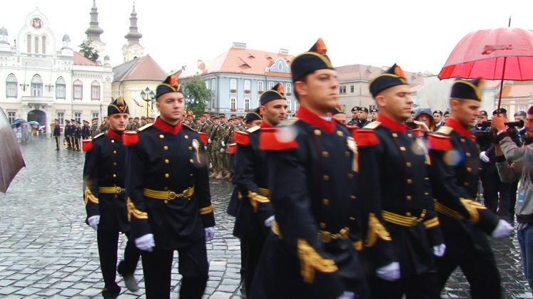 Momentului sărbătoresc i-a fost ciuntit fastul din cauza vremii potrivnice dar soldații totuși au defilat cu entuziasm prin băltoace cu uniformele îngreunate de apă.
