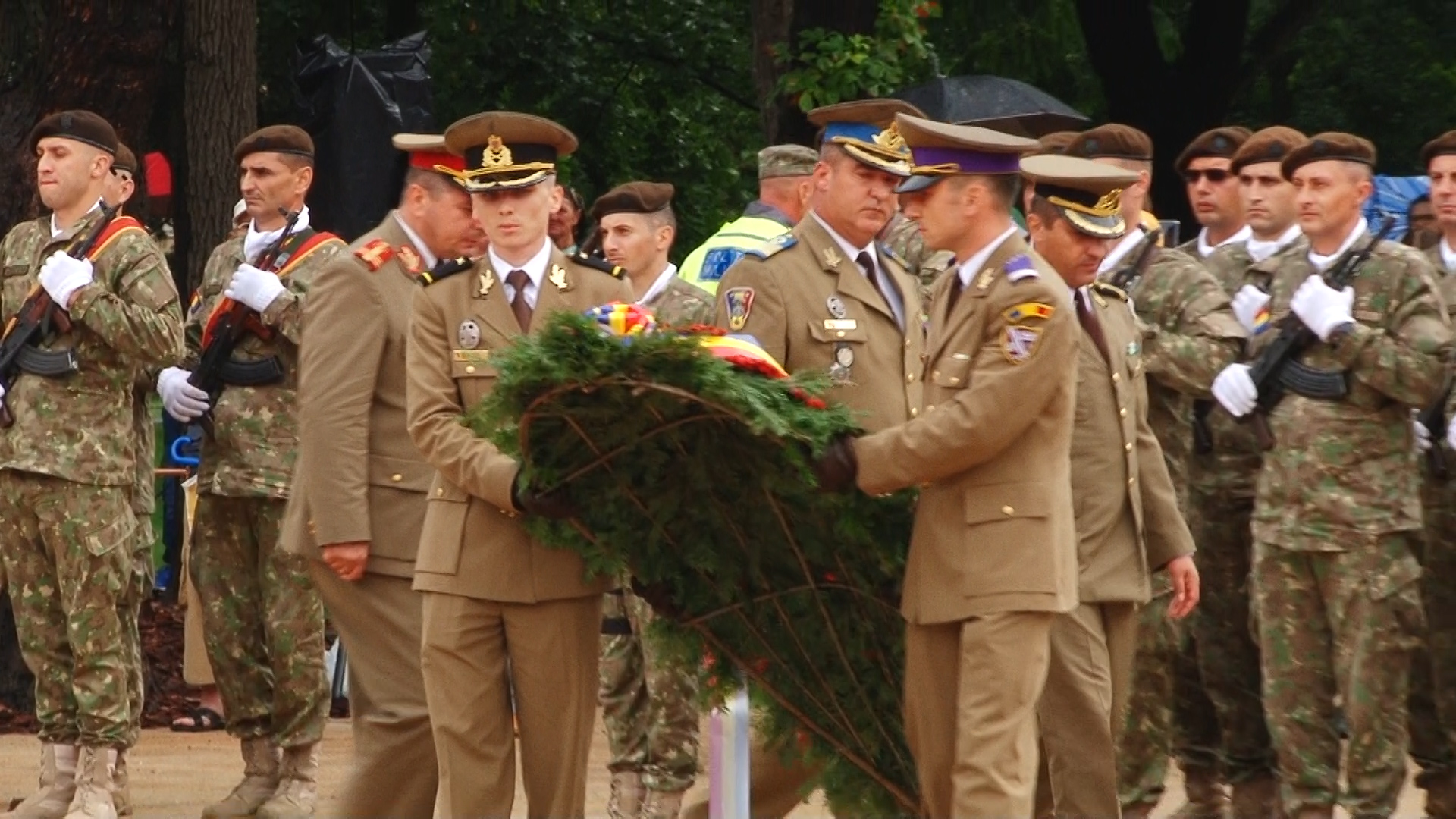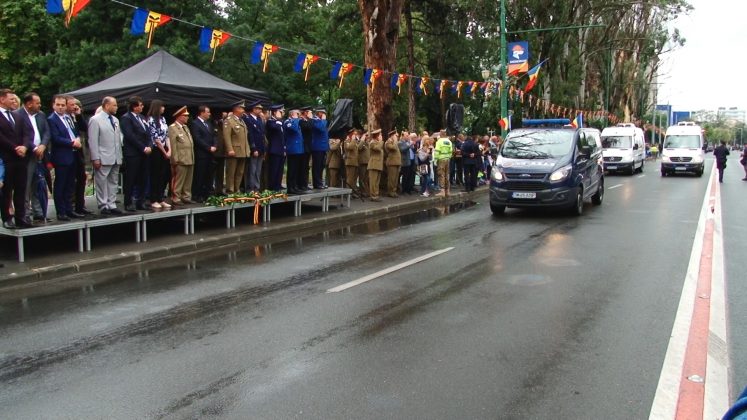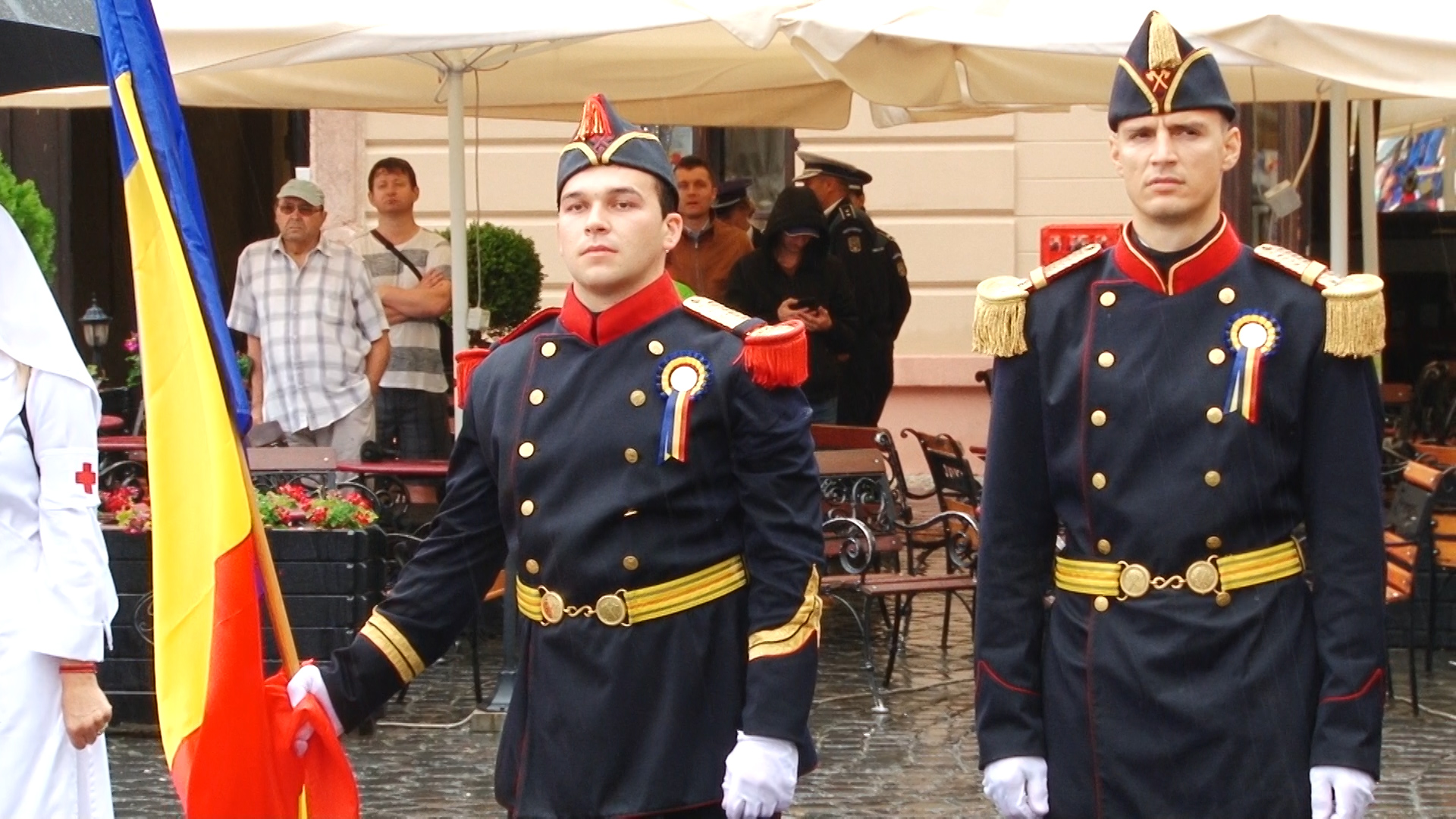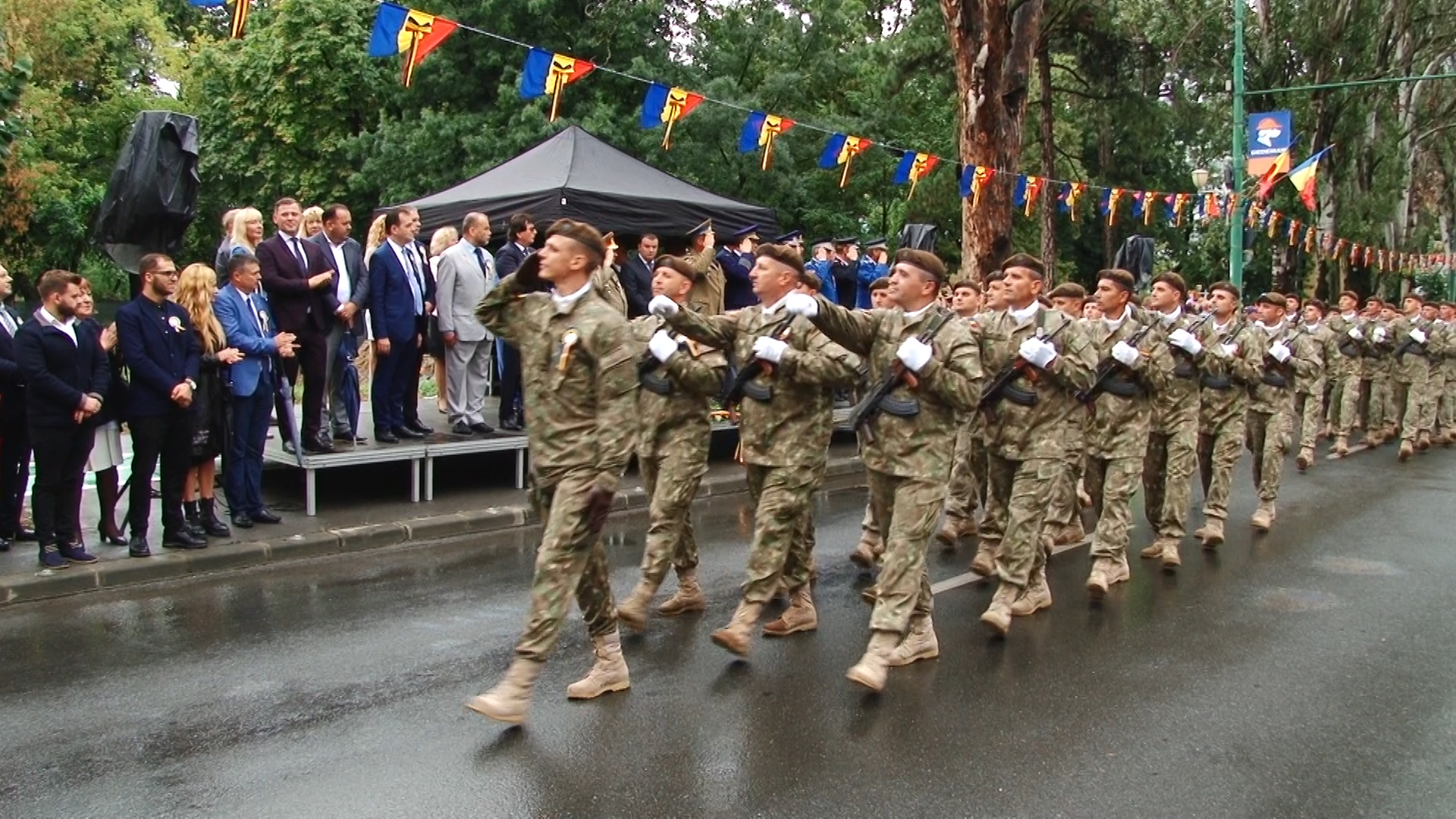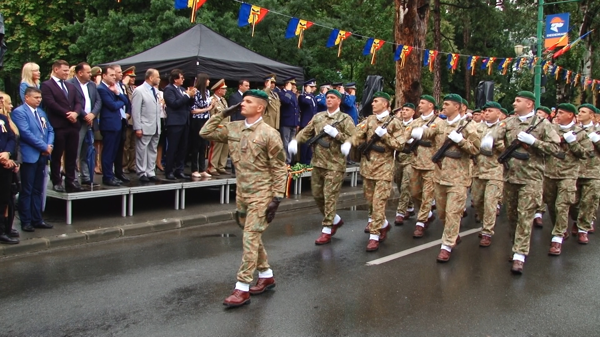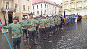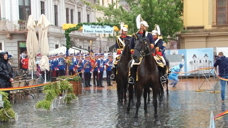 Momentului sărbătoresc i-a fost ciuntit fastul din cauza vremii potrivnice dar soldații totuși au defilat cu entuziasm prin băltoace cu uniformele îngreunate de apă.