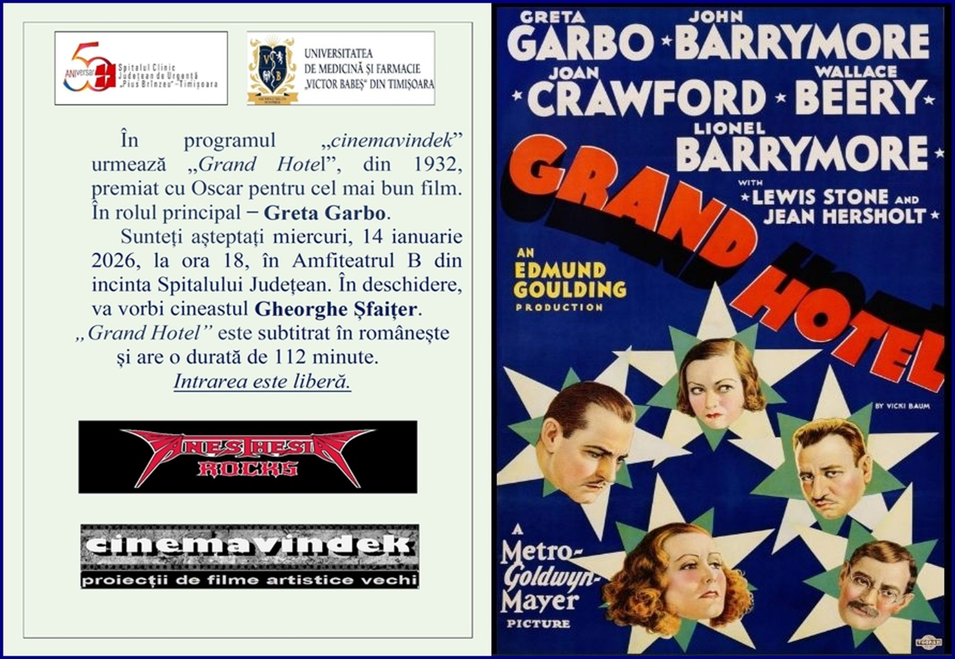 Sunteți așteptați miercuri, 14 ianuarie 2026, la ora 18, în Amfiteatrul B din Spitalul Județean.