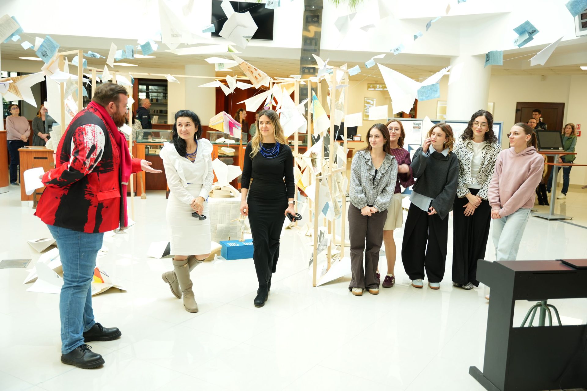Un moment aparte al evenimentului a fost prezentarea instalației artistice „Zborul Cunoașterii”, realizată de studenții din anul I ai Facultății de Arhitectură și Urbanism din Timișoara, specializarea Mobilier și Amenajări Interioare, sub coordonarea conf. dr. arh. Andreea Anghel și conf. dr. arh. Cristina Povian. Pornind de la un proces de brainstorming, studenții au imaginat o instalație care combină pagini de carte și avioane din hârtie realizate din foste planșe ale studenților-arhitecți – simboluri ale efortului, creativității și parcursului educațional. În centrul compoziției se află omul și cartea deschisă, mesajul transmis fiind acela că dezvoltarea personală și profesională se construiește prin cunoaștere.