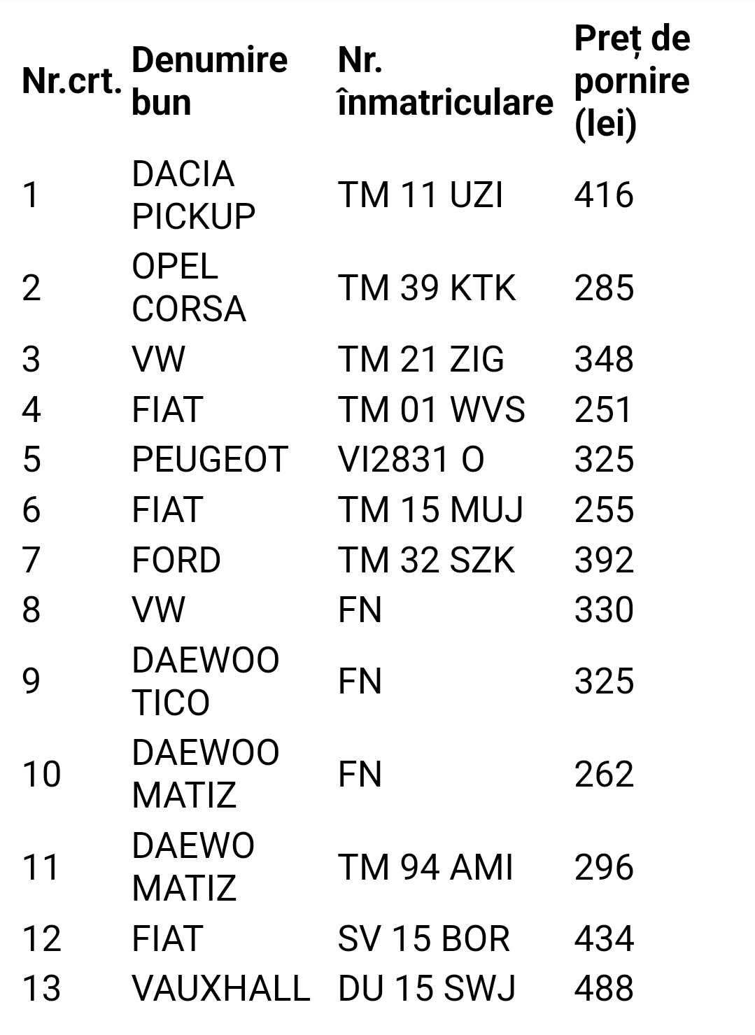Subscrisul Serviciul Public de Interes Local pentru Administrarea Parcărilor Publice din Municipiul Timișoara – TIMPARK, cu sediul în Municipiul Timișoara, Splaiul Nicolae Titulescu, nr. 10, jud. Timiș, CIF RO45421239, e-mail: juridic@timpark.ro și număr de telefon: 0256493393, anunță organizarea licitației deschisă cu strigare, pentru valorificarea următoarelor vehicule fără stăpân/abandonate pe terenuri aparținând domeniului public sau privat al statului ori al unității administrativ-teritoriale Municipiul Timișoara, trecute de drept în proprietatea privată a Municipiului Timișoara:
