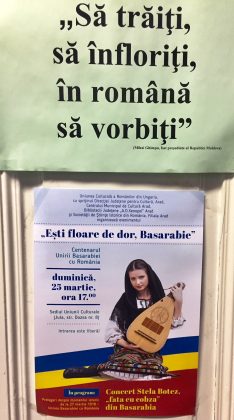 Sub genericul „Ești floare de dor, Basarabie!”, la sediul din Gyula al Uniunii Culturale a Românilor din Ungaria (UCRU), a avut loc recent o manifestare culturală dedicată Centenarului Unirii Basarabiei cu România, având în centrul ei un concert de pricesne și folclor autentic basarabean, oferit de artista Stela Botez, cunoscută sub numele de scenă de „Fata cu cobză din Basarabia”, dar și prelegeri despre momentul istoric din 27 martie 1918, ce a consemnat unirea Basarabiei cu România.