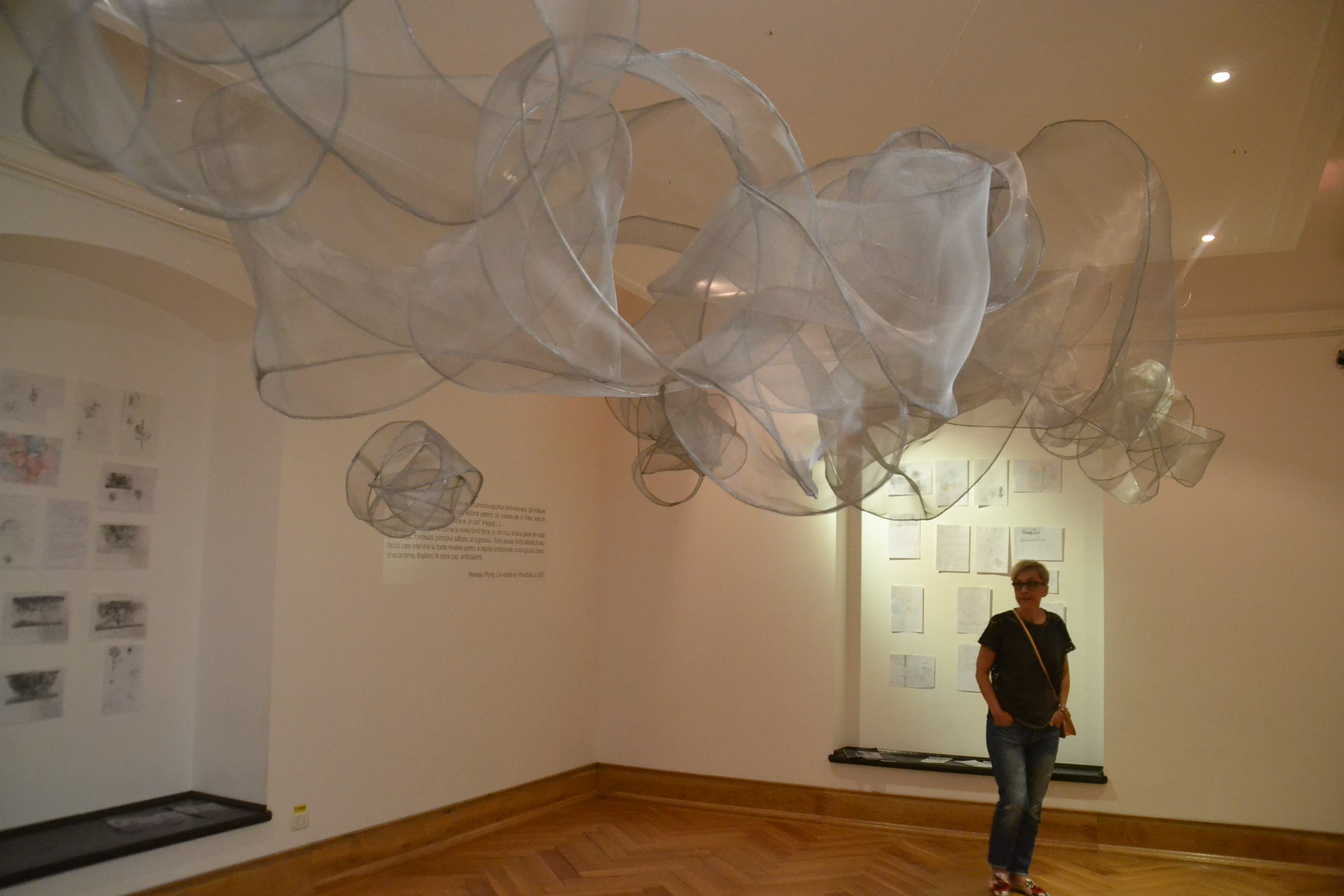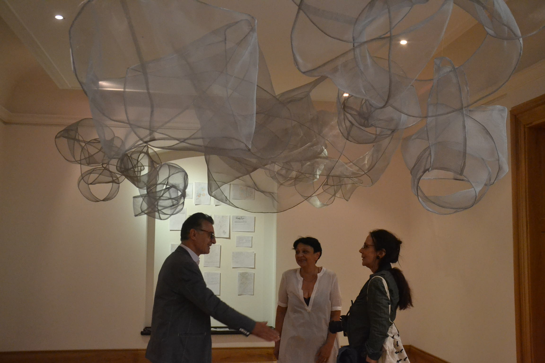 Când intri într-o sală de expoziție și deasupra capului nu vezi tavanul, ci norii, e clar că acolo se va întâmpla ceva deosebit. Iar norii închipuiți de Marina Bejan nu sunt deloc apăsători și negri, ca cei prevestitori de furtuni năprasnice, ci pufoși, ca cei de primăvară, ce aduc vremea bună.