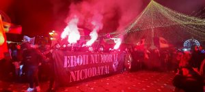Ca în fiecare an un masiv grup de „chibiți” alb-violeți uită de încrâncenările provocate de fotbal și se gândesc la cei ce au pătimit pentru noi toți. Sunt băieții din Druckeria și Peluza Sud Timișoara, mulți dintre ei nici nu erau pe lume în acele momente, dar simt la fel ca acei tineri din 89. Ei au schimbat steagurile cu două culori pentru tricolorul național cu binecunoscuta gaură simbol și au pornit în marș pentru neuitarea eroilor căzuți.