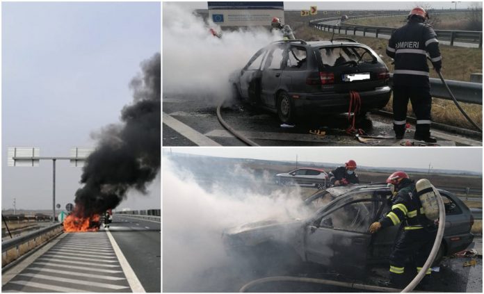 O mașină a luat foc pe autostradă, în județul Timiș. Șoferii spun că incidentul a avut loc în zona nodului rutier Balinț, în urmă cu câteva minute. Circulația nu este afectată, deoarece șoferul a apucat să oprească mașina pe banda de urgență.