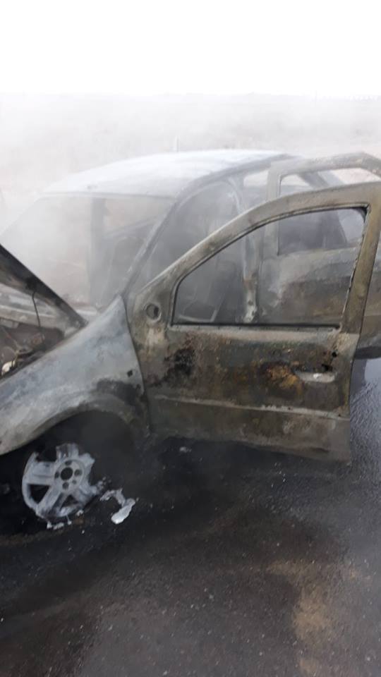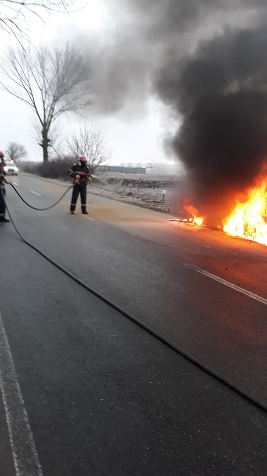 Șoferul a reușit să iasă teafăr afară, dar paână la sosirea de urgență a pompierilor, mașina s-a făcut scrum.