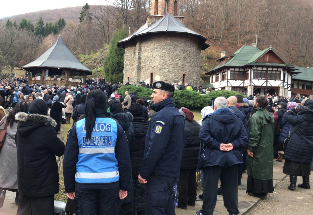 Efective de jandarmi din cadrul Grupării Mobile Timişoara asigură măsuri de ordine și siguranța participanților la manifestările care au loc sâmbătă, 28 noiembrie, la mănăstirea Prislop din județul Hunedoara.