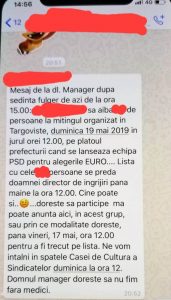 „Lista cu persoanele se predă doamnei director de îngrijiri până mâine la ora 12.00. Cine poate şi … doreşte să participe, mă poate anunţa aici, în acest grup, sau prin ce modalitate doreşte, până vineri, 17 mai, ora 12.00, pentru a fi trecut pe listă”, potrivit sms-ului