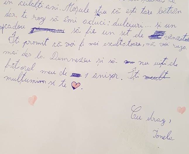 Sute de copii sărmani au trimis scrisori către Moş Crăciun. Au ajuns însă în Arad, la Alexandra Timar. Scrisorile copiilor sunt pur şi simplu tulburătoare. Ei visează ca Moş Crăciun să le aducă o portocală, o banană, o pungă de pufuleţi sau… mentosane.