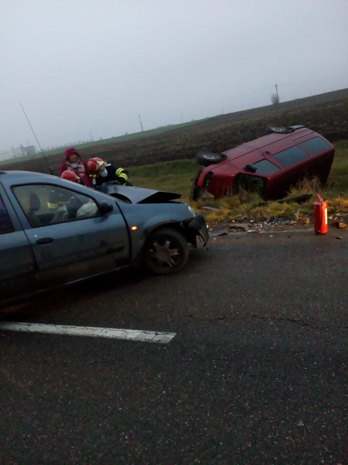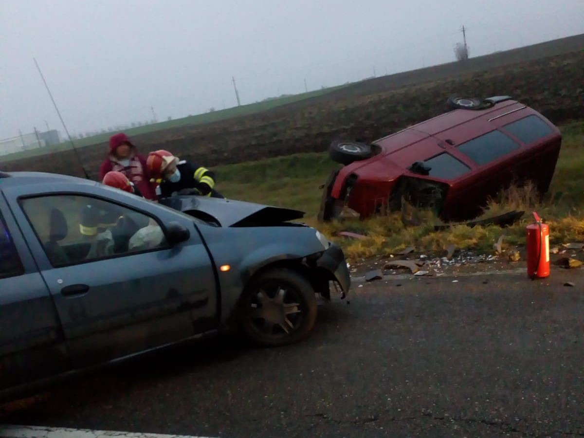 Un accident de circulație a avut loc, vineri dimineață, pe drumul județean 692 din Timiș. Au fost implicate un microbuz și un autoturism, iar în urma impactului, primul vehicul a ajuns cu rotile în sus, pe marginea șoselei.