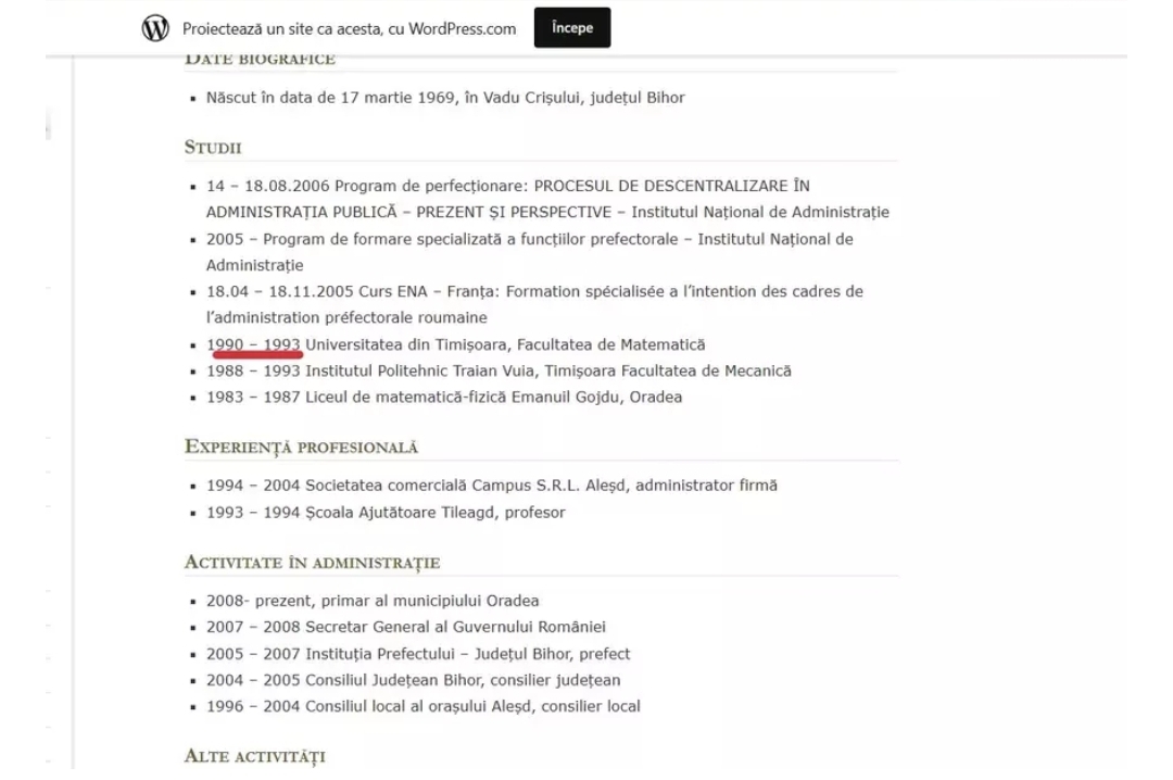 Ilie Bolojan, în dreptul Facultății de Matematică de la UVT este trecută perioada 1990 – 1993. Trei ani de studii, adică. Nu cinci, cât menționează site-ul UVT.