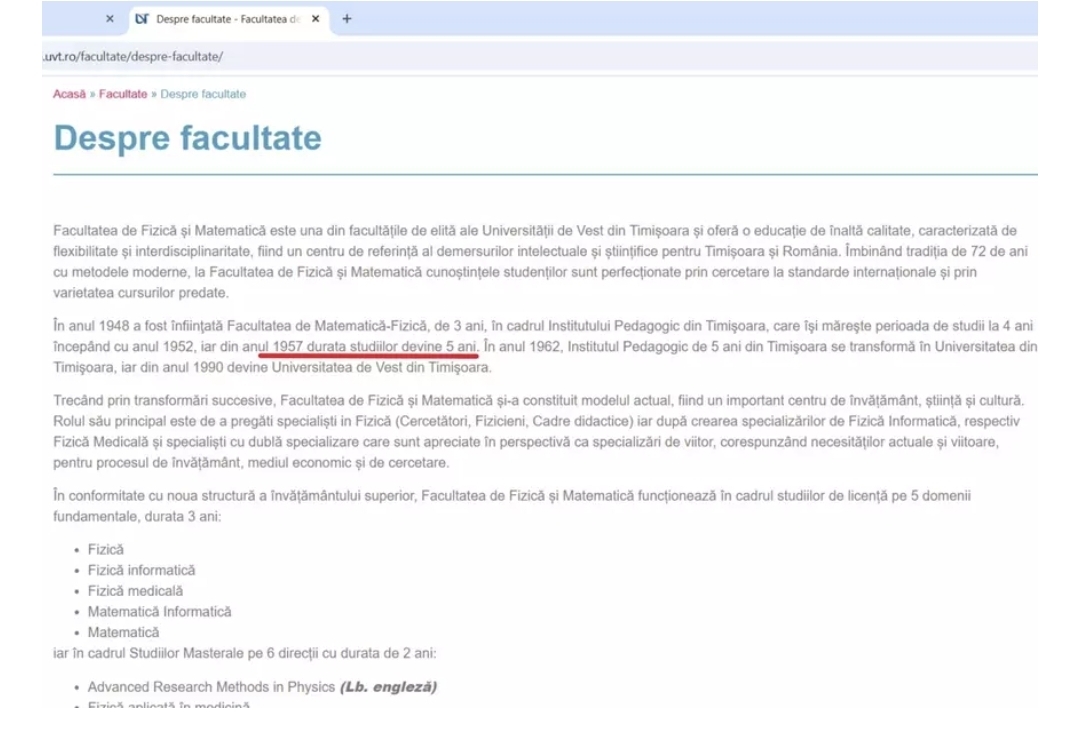 „În anul 1948 a fost înfiinţată Facultatea de Matematică-Fizică, de 3 ani, în cadrul Institutului Pedagogic din Timişoara, care îşi măreşte perioada de studii la 4 ani începând cu anul 1952, iar din anul 1957 durata studiilor devine 5 ani. În anul 1962, Institutul Pedagogic de 5 ani din Timişoara se transformă în Universitatea din Timişoara, iar din anul 1990 devine Universitatea de Vest din Timişoara”.