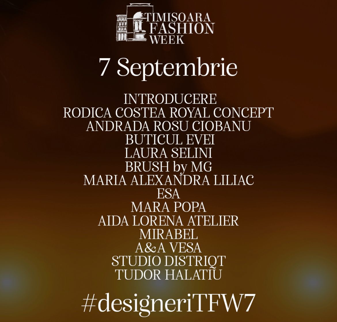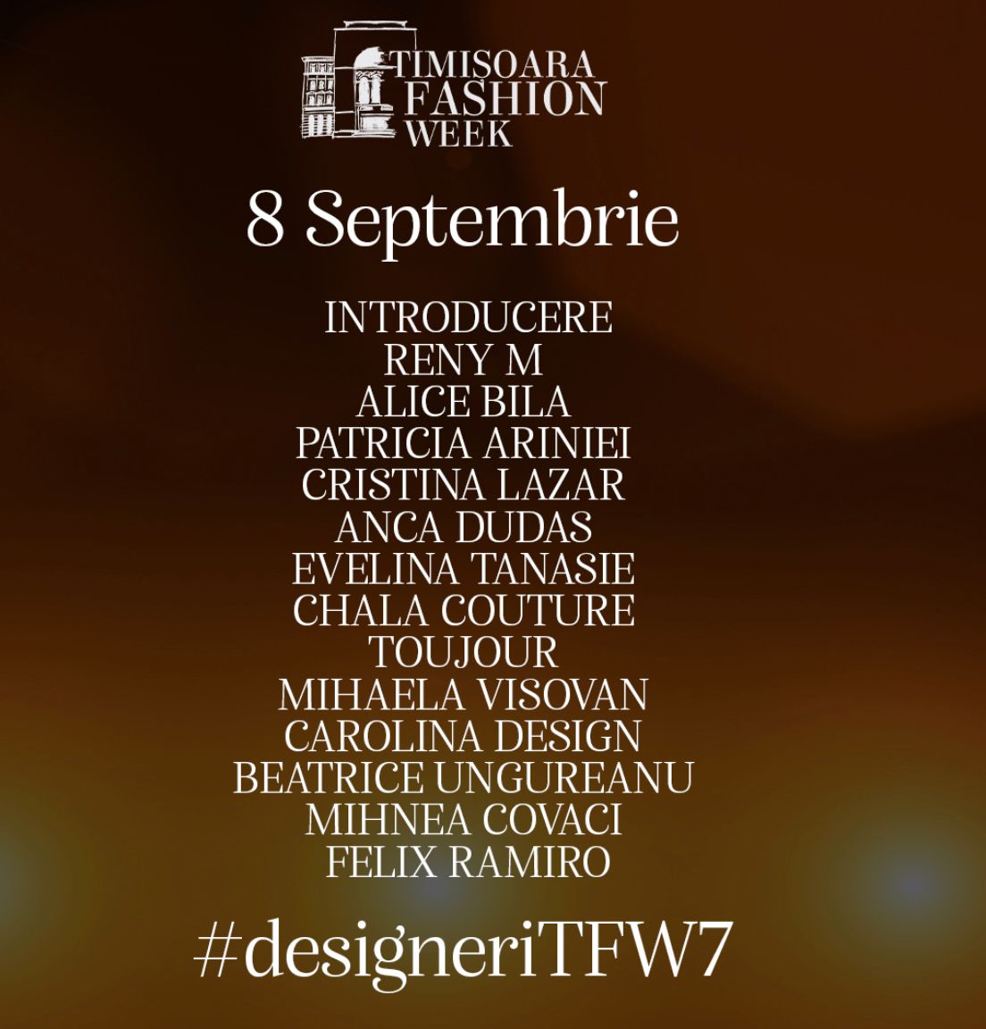 Aflat la cea de-a şaptea ediţie, denumirea generică a evenimentului din acest an este „Construction Couture”. Timișoara Fashion Week, organizat de Rodica Costea și prezentat, ca în fiecare an, de Cosmina Păsărin, va reuni designeri din România şi din străinătate, dar şi vedete şi influenceri, cum este Ana Morodan. O altă surpriză va fi prezenţa lui Dorian Popa, vedeta colecției designerului spaniol Felix Ramiro, şi a Adelinei Pestriţu, brand ambasador Cupio.