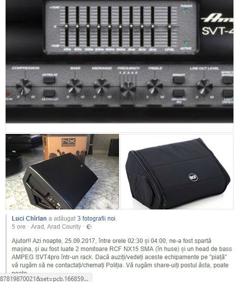 „Ajutor!! Azi noapte, 25.09.2017, între orele 02:30 și 04:00, ne-a fost spartă mașina, și au fost luate 2 monitoare RCF NX15 SMA (în huse) și un head de bass AMPEG SVT4pro într-un rack. Dacă auziți/vedeți aceste echipamente pe „piață” vă rugăm să ne contactați/chemați Poliția. Vă rugăm share-uiți postul ăsta, poate poate…”, este apelul pe care muzicienii îl fac la toţi arădenii dar nu numai.
