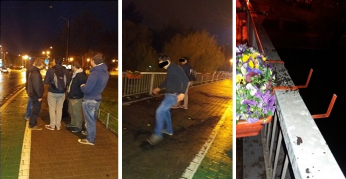 O patrulă a Poliţiei locale din Timişoara a surprins doi tineri care au smuls un ghiveci cu flori de pe Podul Michelangelo, l-au golit de pământ și de flori și l-au aruncat într-un coș de gunoi.