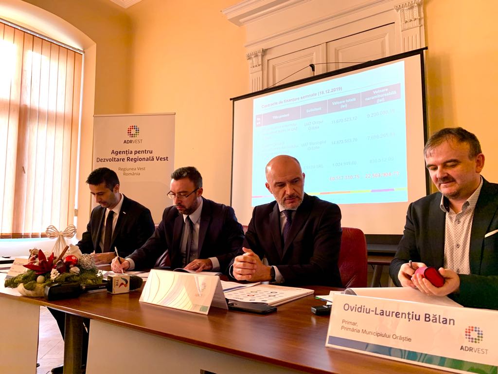 Trei noi contracte de finanțare în cadrul Regio-POR 2014-2020 au fost semnate astăzi, de ADR Vest și Primăria Municipiului Orăștie, Primăria Orașului Gătaia și compania ETA2U: