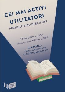 La fel ca la edițiile precedente, dintre utilizatorii Bibliotecii UPT (între 1.000 – 3.000 pe zi!) sunt premiați cei mai activi, atât dintre cei interni (cadre didactice și studenți ai Universității Politehnica Timișoara), cât și externi. Anul acesta vor fi premiați patru utilizatori, doi interni și doi externi, care au avut cea mai activă prezență în bibliotecă, respectiv care au avut cele mai multe împrumuturi.