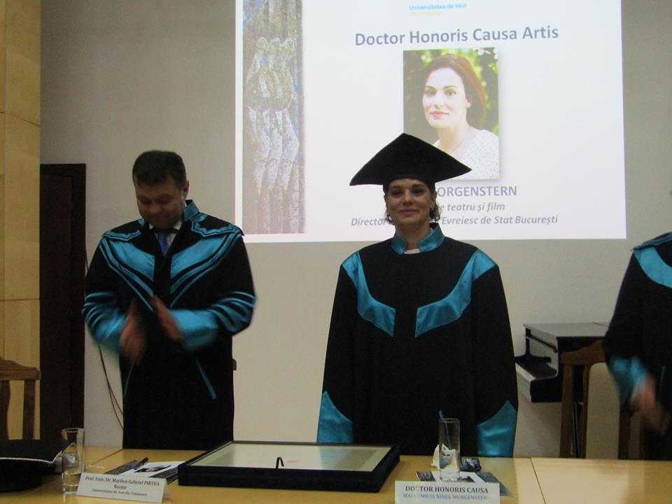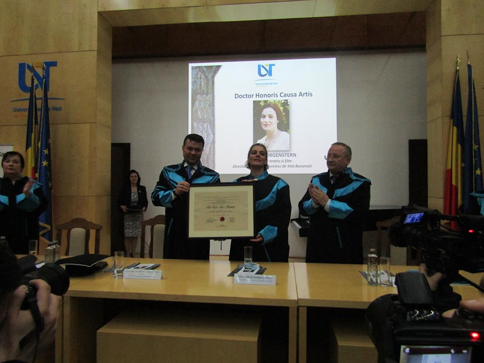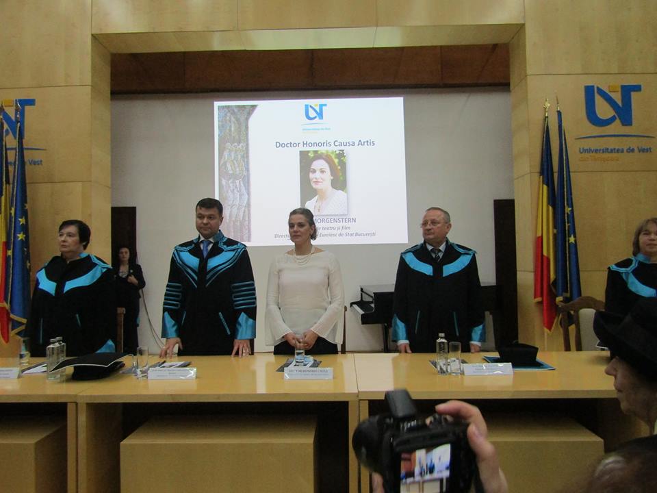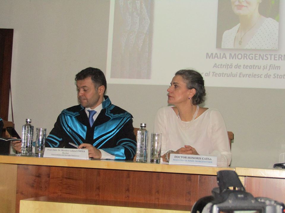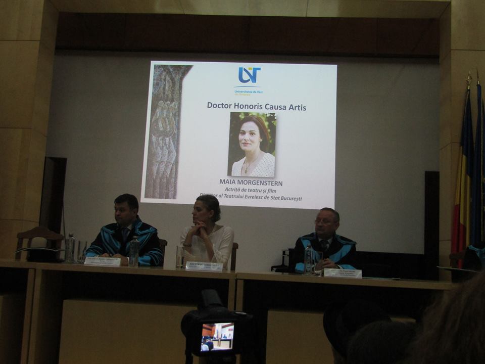 Universitatea de Vest DIN Timişoara a acordat titlul de Dr. Honoris Causa, actriţei Maia Morgenstern, director al Teatrului Evreiesc de Stat Bucureşti, pentru întreaga sa activitate artistică de peste 30 ani.