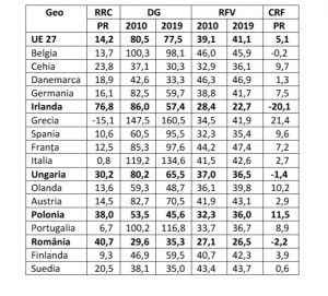 Surse de date: (1), (2), (3). RRC – rate reale de creștere a PIB (%); PR – perioada de referință (2010 – 2019); DG – datorii guvernamentale (% din PIB); RF – rate ale fiscalității (ponderea procentuală în PIB a impozitelor, taxelor și a contribuțiilor sociale); CRF – creșteri ale ratelor de fiscalitate (%).