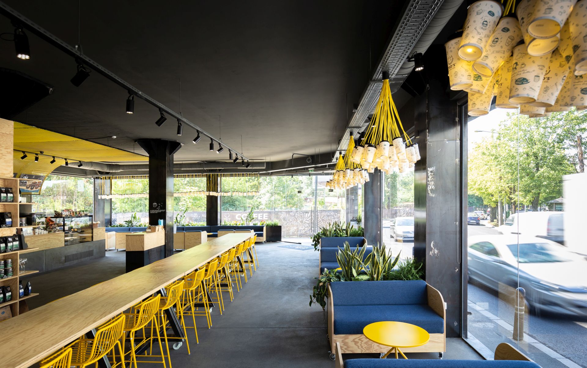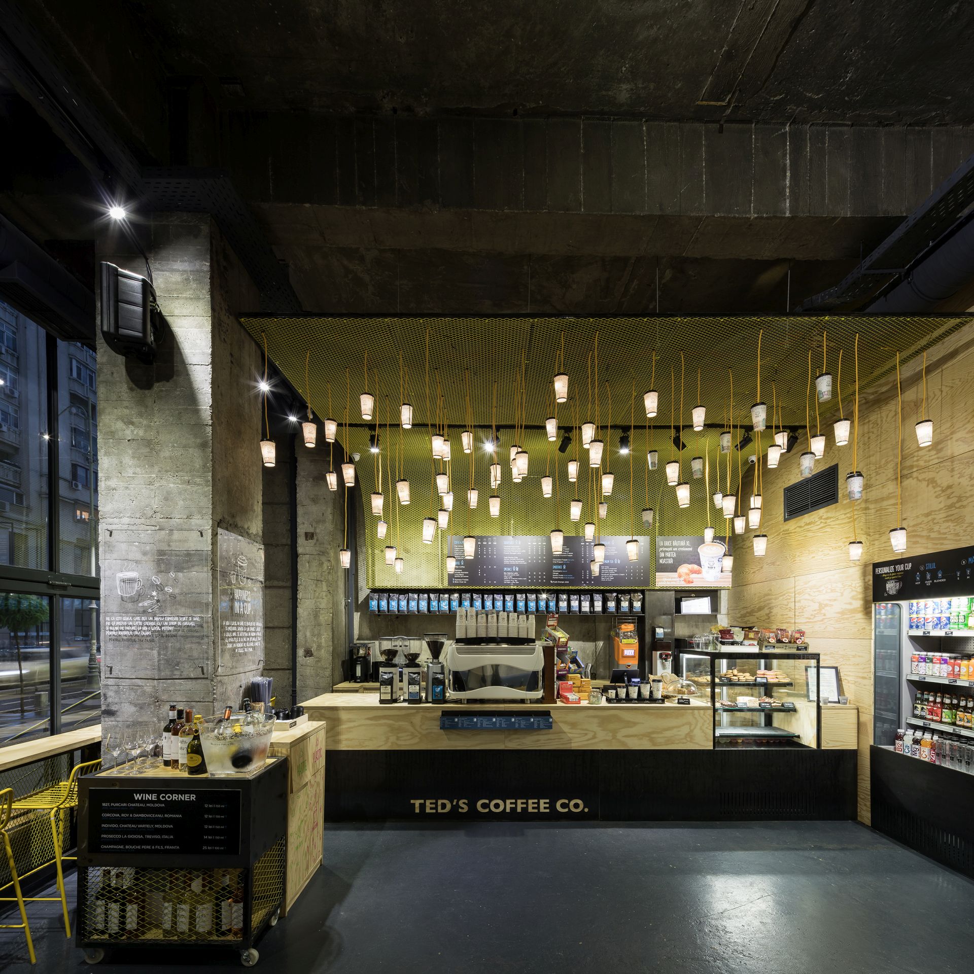 Locaţiile TED’S COFFEE CO. sunt memorabile nu doar datorită specialităţilor delicioase de cafea, ci şi design-ului interior aparte, special conceput de către LAMA Arhitectura. Corpurile de iluminat din pahare de cafea „to-go”, culorile vii, mobilierul din lemn de mesteacăn sau pereţii industriali sunt doar o parte dintre elementele care contribuie la redarea unei atmosfere relaxante şi, totodată, inconfundabile.