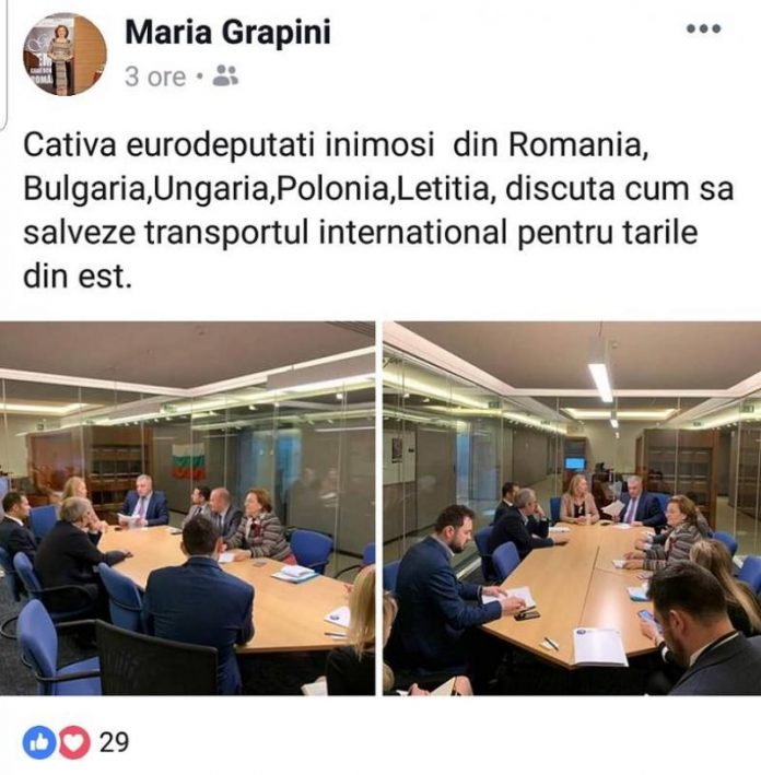 Maria Grapini a scris: „Câțiva eurodeputați inimoși din România, Bulgaria, Ungaria, Polonia, Letiția, discută cum să salveze transportul internațional pentru țările din est”.