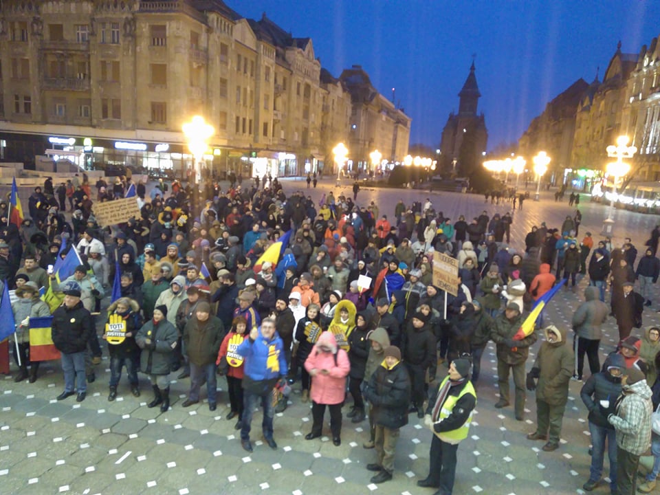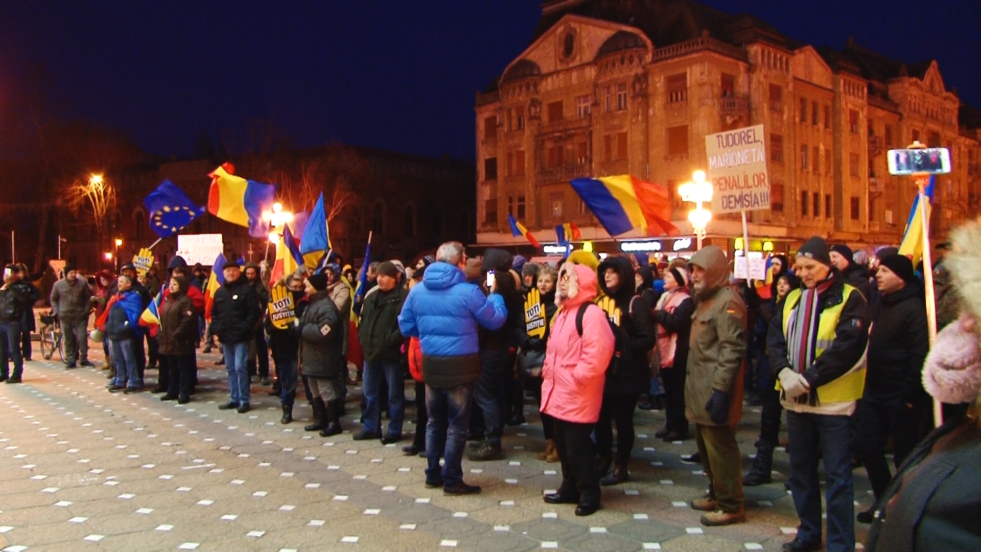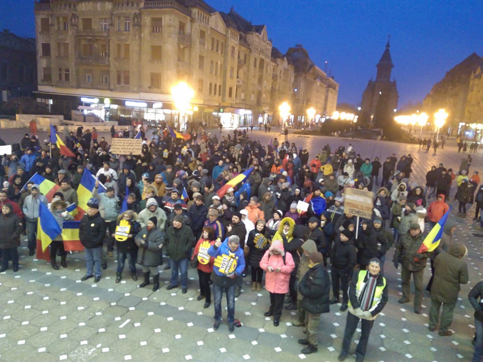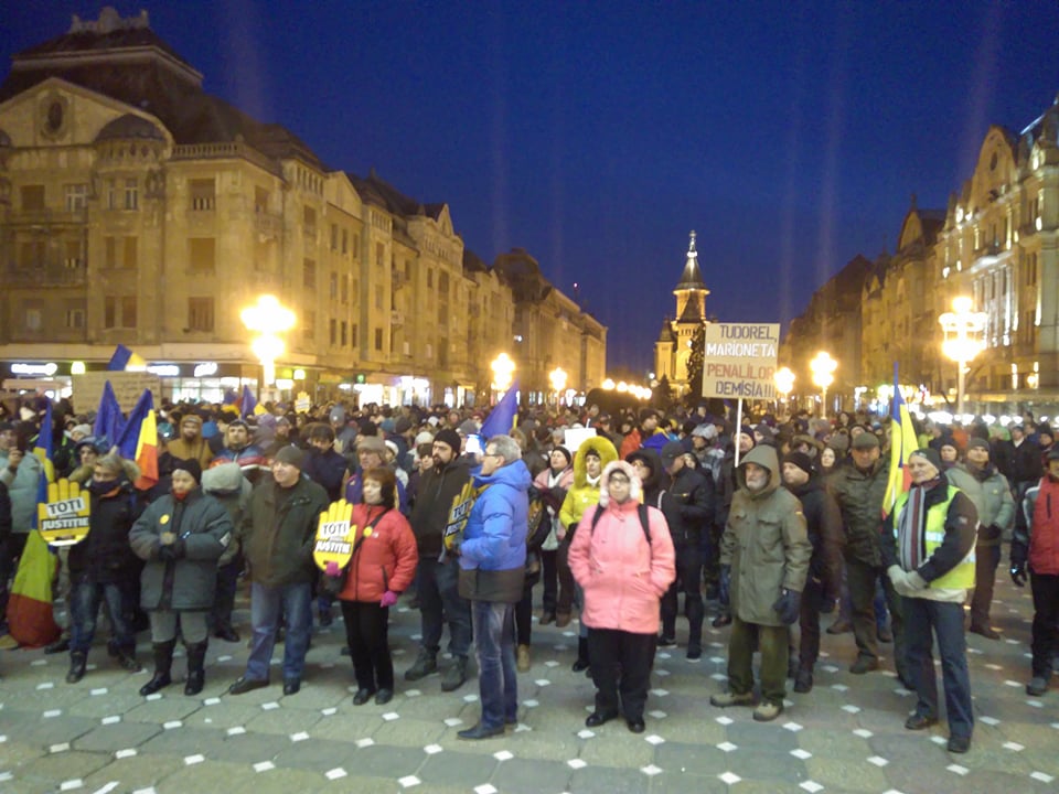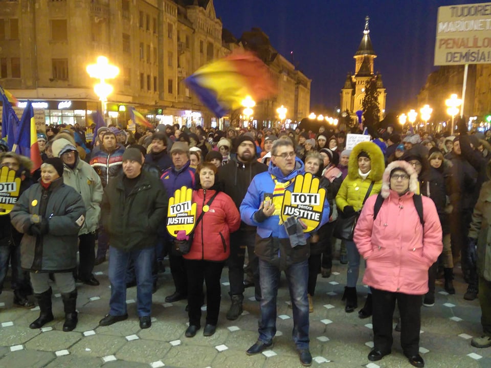 Update 3: Protestul de la Timișoara s-a încheiat.  Nu au fost incidente. Printre lozincile strigate în Piața Victoriei sau numarat: Tudorel, Tudorel pleacă în statul paralel; Justiție nu coruptie; Nu va fie frica, Dragnea pica; Afară,  afară corupția din tara; DNA suntem de partea ta; Noaptea hoți,  ziua mafioti