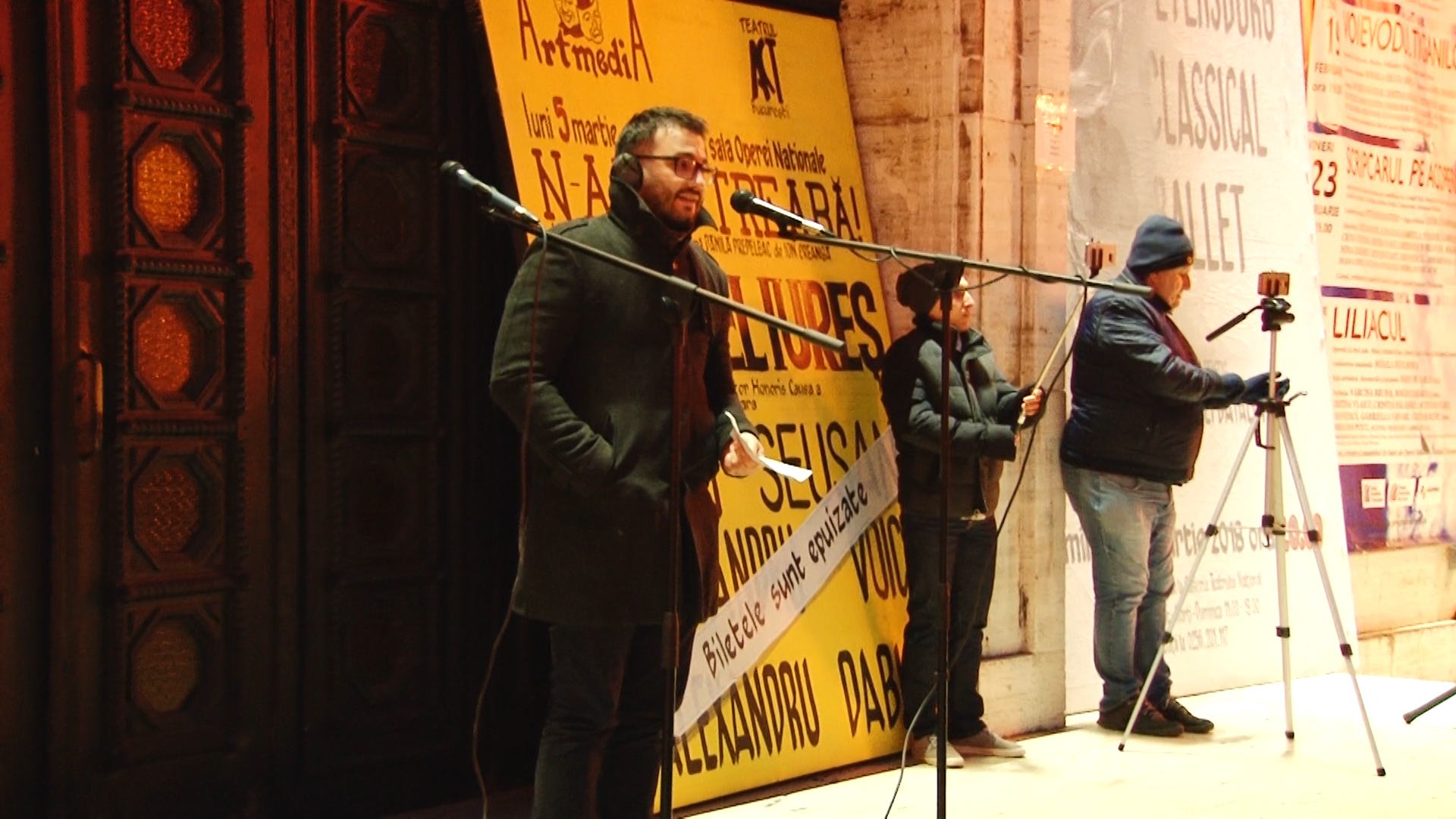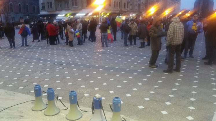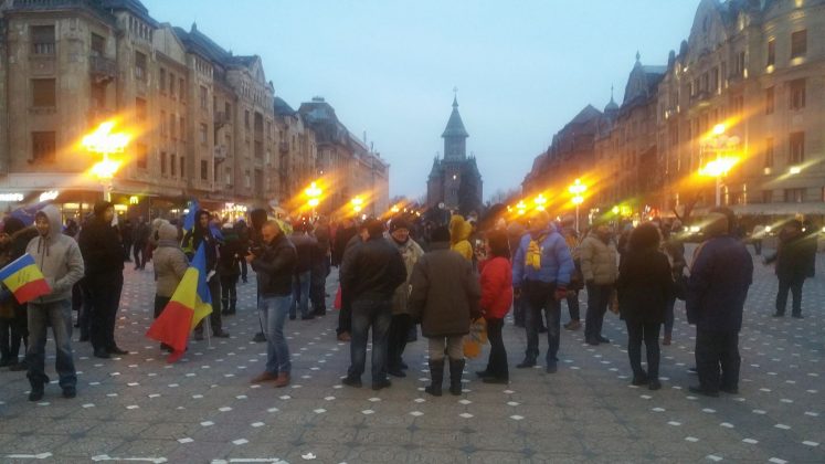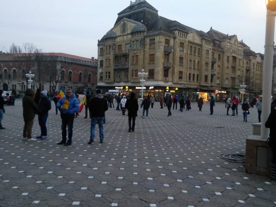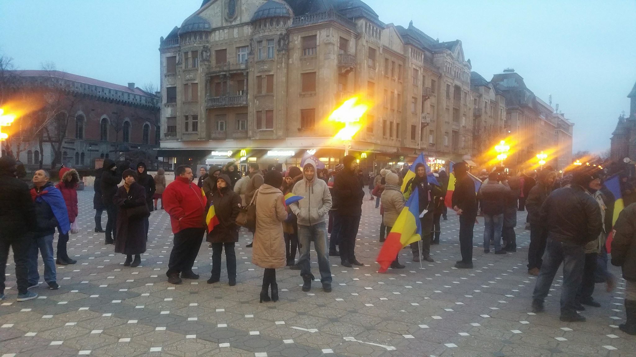 În fata Operei Naționale Timișoara este un grup de persoane care au adus steaguri, pancarte și un sistem de sunet. Sunt așteptate peste 1.000 de persoane. Protestul este unul autorizat.