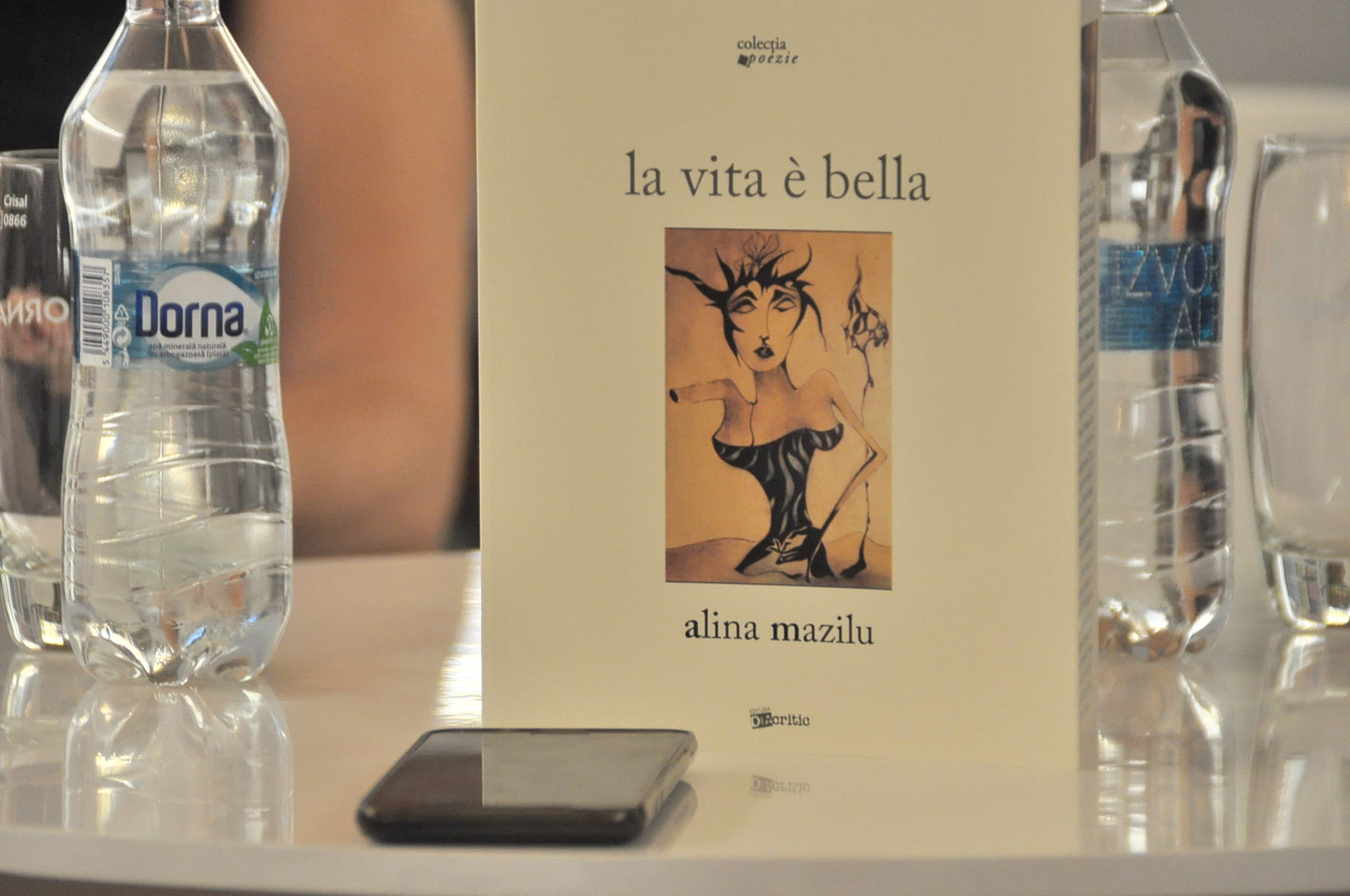 „Și cartea acesta are un nume de împrumut. Ca orice doamnă ce se respectă își permite acest lux, să aibe un un nume de împrumut. Este un spectacol de și cu Alina Mazilu. Este regizat de Alina Mazilu după un roman de Alina Mazilu. Un spectacol integral de autor. Carte nu este doar dramă cum s-ar putea crede ci este și multă comedie. E o carte ce s-a născut doamnă” continua seria jocurilor de cuvinte și editorul Adrian Bodnaru.