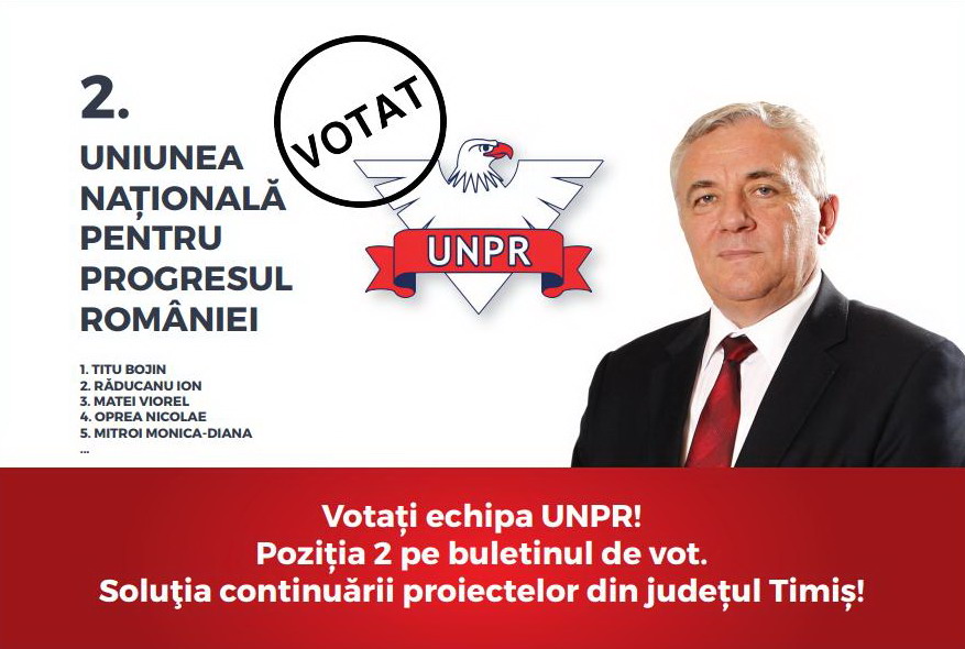 Votați Titu Bojin, președinte al Consiliului Județean Timiș, primul pe listele UNPR, poziția 2 pe buletinele de vot, pentru CJT