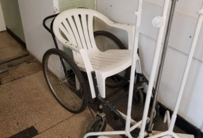 Pacienții care ajung la una dintre secțiile de chirurgie ale Spitalului Județean de Urgență Craiova sunt transportați cu un scaun de bar. Acesta este din plastic și a fost așezat pe un cadru cu rotile, în locul căruciorului.