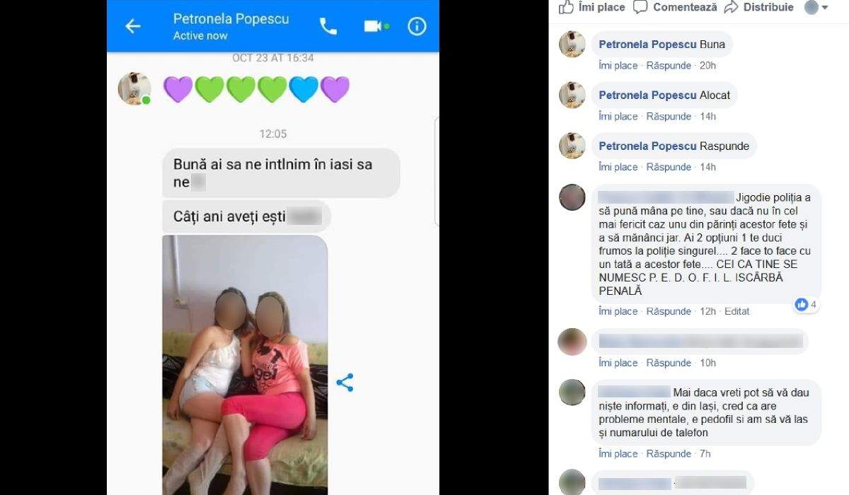 ‘Individul din Iaşi are un cont de facebook pe numele de Petronela Popescu în care efectiv hărţuieşte fetiţe şi vorbeşte vulgar. Trebuie oprit!’, scrie mama unei fetiţe din judeţul Gorj.