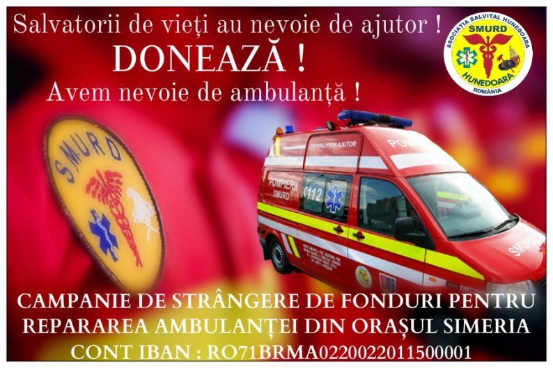 Asociația “Salvital” Hunedoara va demara campania de strângere de fonduri: „Salvatorii de vieți au nevoie de ajutor! Donează! Avem nevoie de ambulanță!”  pentru repararea ambulanței SMURD Simeria, începând cu data de 3 septembrie 2018.