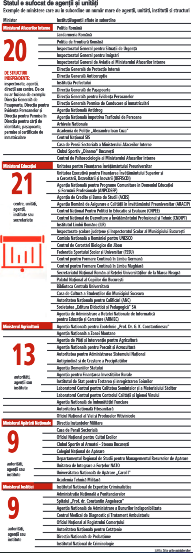 ZF a luat drept exemplu cinci ministere: Ministerul Afacerilor Interne, Ministerul Educaţiei, Ministerul Agriculturii, Ministerul Apărării Naţionale şi Ministerul Justiţiei. Fiecare minister gestionează un număr mare de instituţii şi agenţii. De exemplu, Ministerul Afacerilor Interne are în subordine 20 de agenţii, direcţii, instituţii.