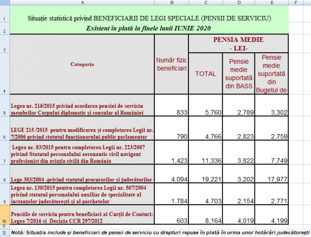 În ce priveşte cele şase categorii de pensii speciale, datele Casei de Pensii arată că cea mai mare creştere au înregistrat-o pensiile foştilor judecători şi procurori, de la 19.039 lei în luna mai, la 19.221 lei în luna iunie, respectiv 182 de lei în plus, de peste 45 de ori mai mult decât creşterea înregistrată de pensiile de rând.