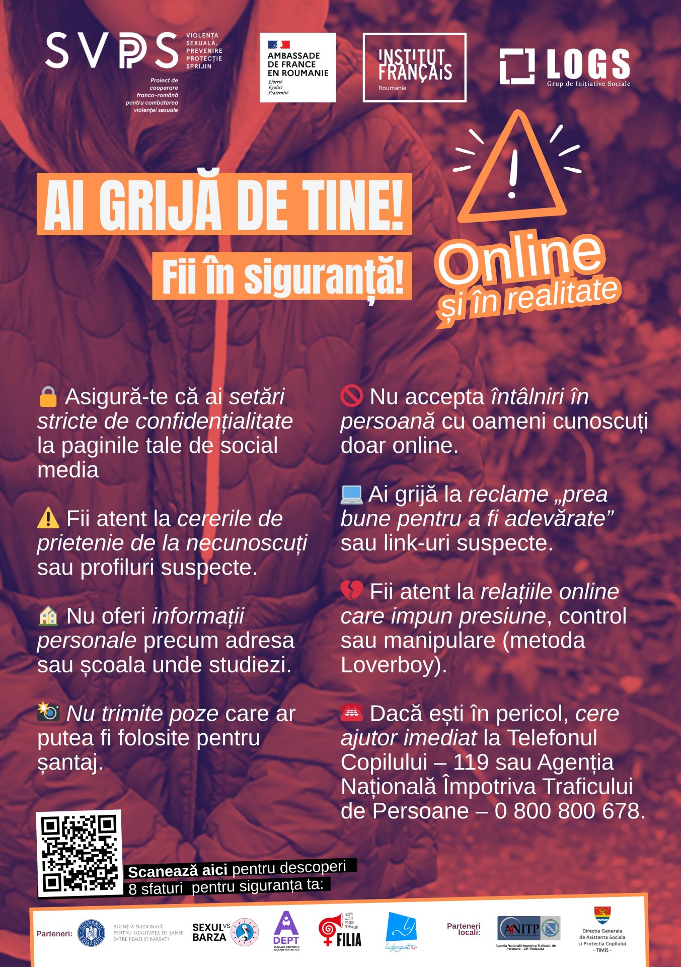 Asociația LOGS – Grup de Inițiative Sociale, cu sprijinul Ministerului Francez de Afaceri Externe, a implementat în luna Martie și Aprilie proiectul „Violența sexuală: prevenire, protecție, sprijin” cu rol de informare și sensibilizare adresat direct tinerilor din Timiș cu scopul de a crește gradul de conștientizare asupra riscurilor traficului de persoane și exploatării sexuale, în special în mediul online.
